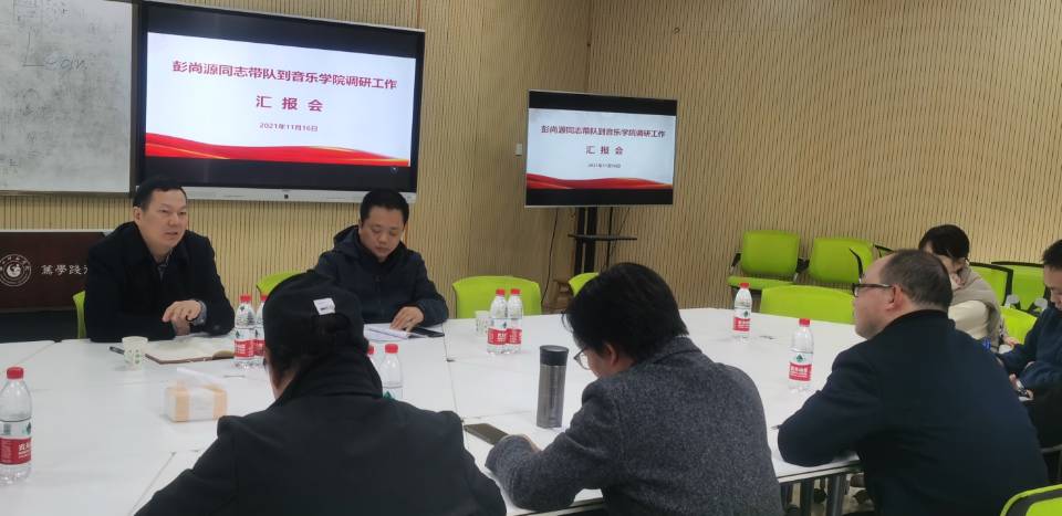 本网讯(图、文/毛敏)11月16日下午,省纪委监委驻卡塔尔世界杯决赛波胆预测 纪检监察组组长、卡塔尔世界杯决赛波胆预测 党委副书记、纪委书记彭尚源到音乐学院调研工作,派驻纪检监察组副组长兼派驻纪检监察组办公室主任、卡塔尔世界杯决赛波胆预测 纪委副书记、纪委办主任邹大勇陪同调研,调研汇报会在音乐学院智慧教室举行,音乐学院科级以上干部、教研室主任、专业负责人参加了会议。
