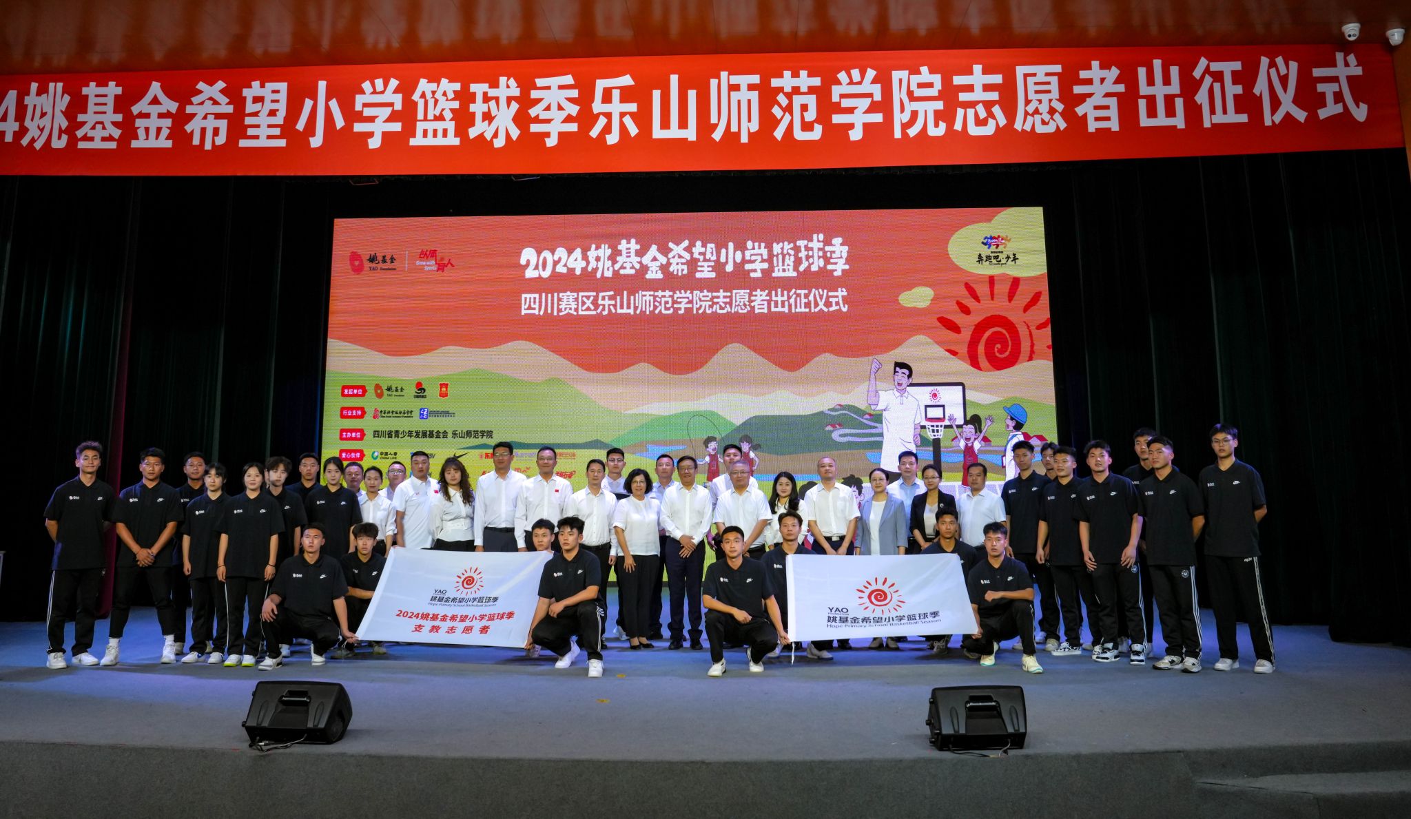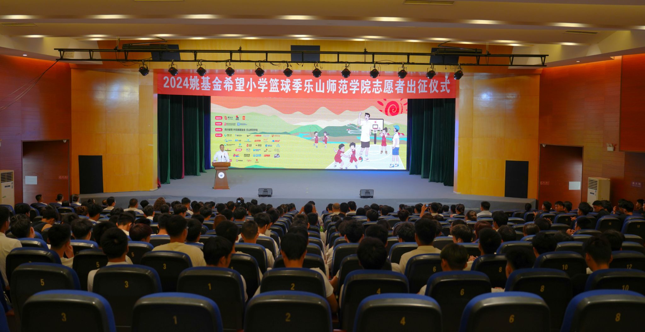 本网讯(文/杨爽 图/杨爽、王兴雨、张芳)4月16日,我校在实训楼大楼多功能厅举行“2024姚基金希望小学篮球季”支教志愿者出征仪式。校党委书记胡丹,姚基金理事蒋英出席出征仪式并讲话。四川省青少年发展基金会理事长胡晓,项目部部长张漆联,共青团乐山市委副书记叶利丽,校党委常委、副校长汪天飞,宜宾市体育管理中心主任张潇、副主任王磊,资阳市雁江区教体局群体股股长蒋昌海及相关职能部门负责人、全体志愿者、体育学院学生代表参加出征仪式。体育学院院长张峰主持出征仪式。