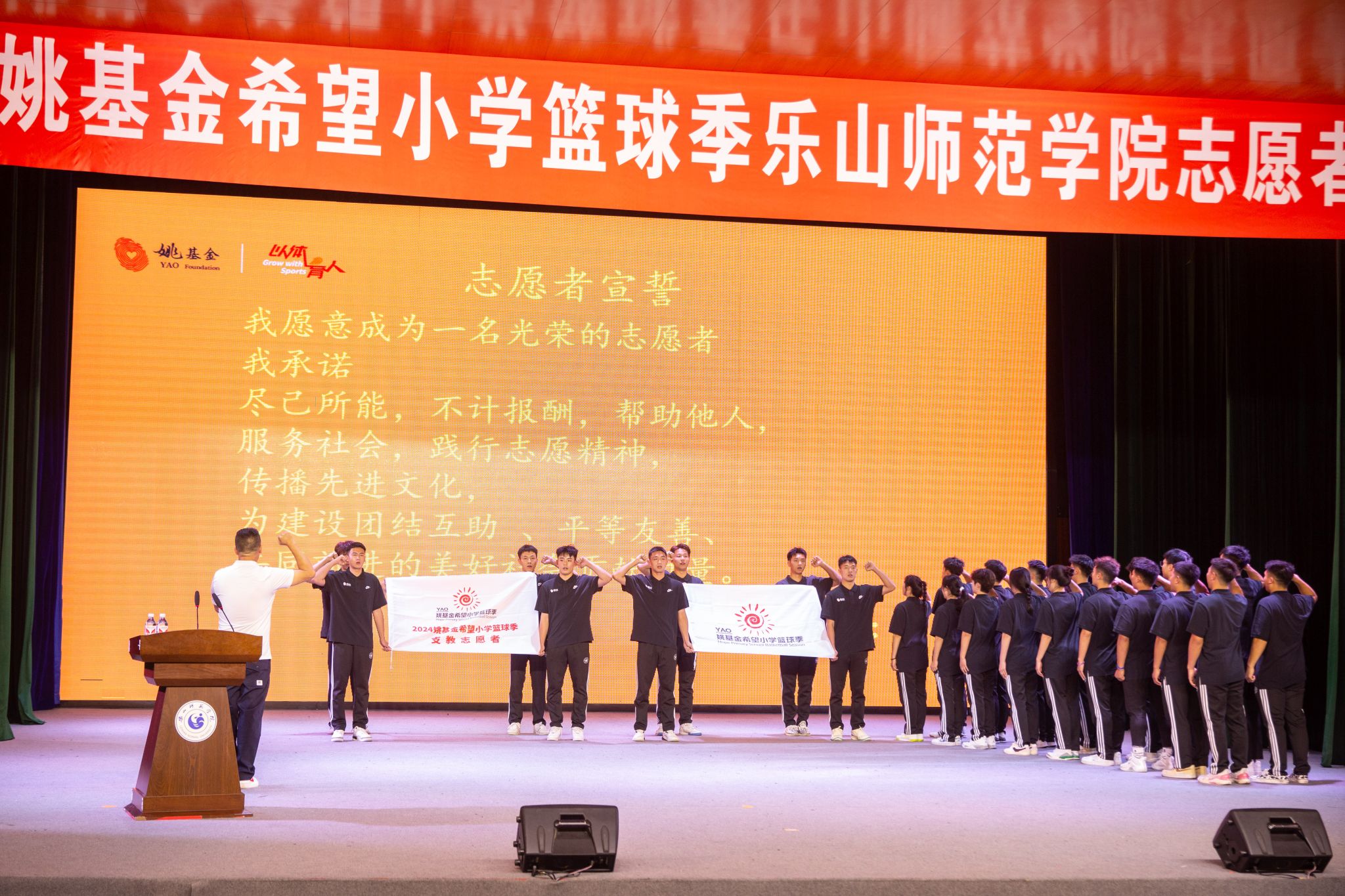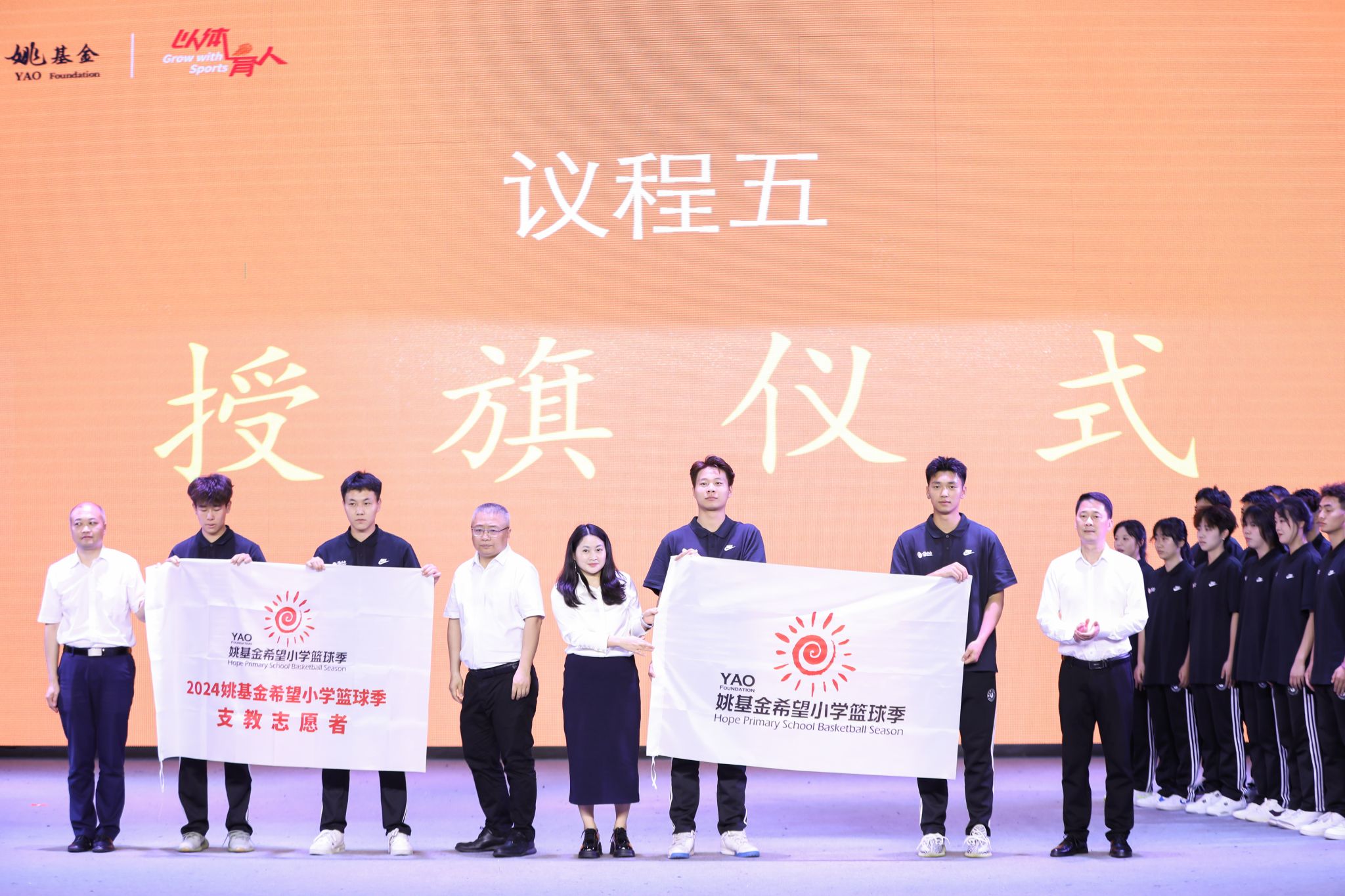 出征仪式在庄严的国歌声中拉开帷幕。与会人员观看了姚基金宣传片,在姚明的致辞中深入了解了姚基金的启动和发展历程。