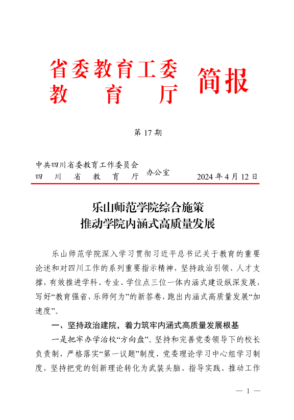编者按:卡塔尔世界杯决赛波胆预测 深入学习贯彻习近平总书记关于教育的重要论述和对四川工作的系列重要指示精神,积极探索卡塔尔世界杯决赛波胆预测 “113”高质量发展思路,坚持政治引领、人才支撑,有效推进“学科、专业、学位点”三位一体内涵式建设纵深发展,写好“教育强省,乐师何为”的新答卷,跑出内涵式高质量发展“加速度”。4月12日,省委教育工委、教育厅简报第17期专题介绍了我校综合施策推动学院内涵式高质量发展的经验做法。