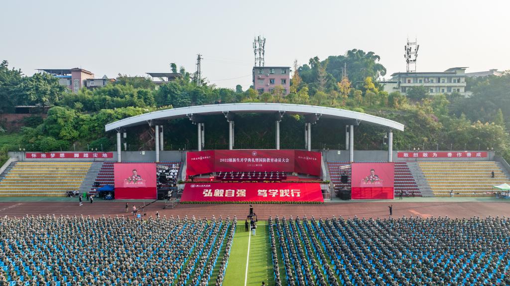 典礼上,党委书记胡丹向军训团授旗。党委副书记、校长刘进发表了题为“弘毅自强 做青春赛道上的持续奋进者”的讲话,为全体新生开讲大学第一课。