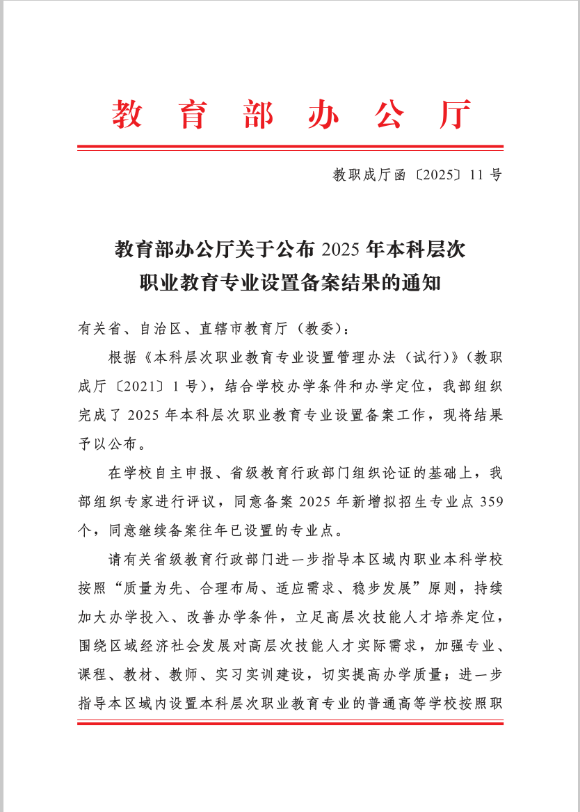 本网讯(文图/李敏)近日,教育部办公厅发布了《关于公布2025年本科层次职业教育专业设置备案结果的通知》,我校电子信息与人工智能学院申报的职业本科专业——电动飞行器应用技术(专业代码260606)正式通过教育部备案。这一专业的成功获批,不仅是我校学科建设的重要突破,更是响应国家低空经济发展战略,对接新兴产业人才需求的重要举措。