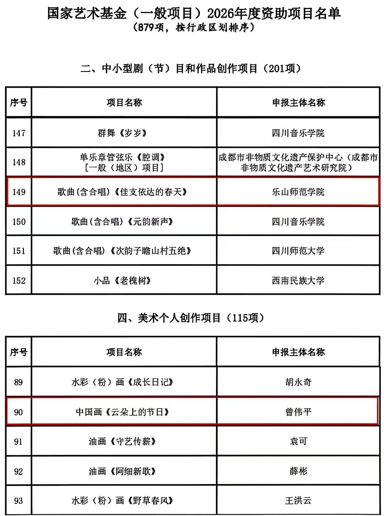 本网讯(文/黄忠林)12月2日至8日,国家艺术基金管理中心正式公布了国家艺术基金2026年度资助项目名单,我校有2个项目成功入选。其中,音乐学院副院长吴映春的歌曲《佳支依达的春天》入选中小型剧(节)目和作品创作项目,美术学院教师曾伟平的中国画《云朵上的节日》入选美术个人创作项目。