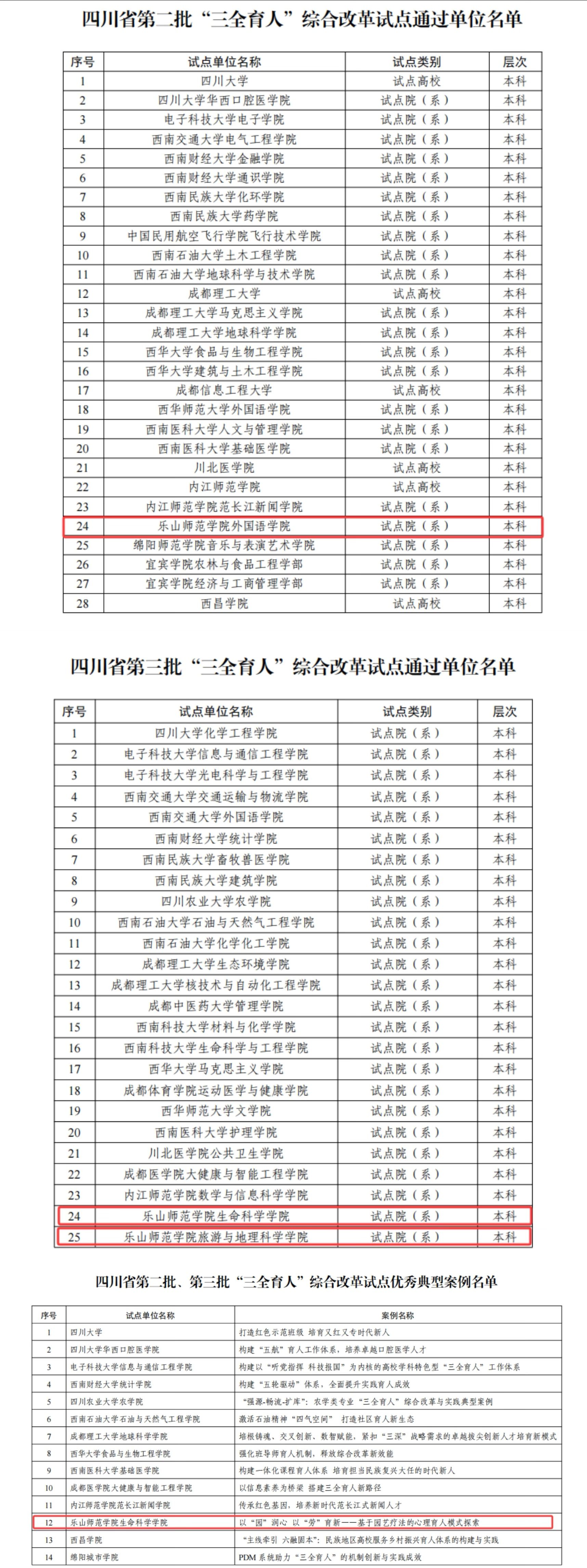 本网讯(文图/杨爽)近日,中共四川省委教育工委办公室发布《关于公布第二批、第三批“三全育人”综合改革试点总结评审结果的通知》。经专家评审、复核等程序,我校外国语学院作为第二批试点院(系),生命科学学院、旅游与地理科学学院作为第三批试点院(系)顺利通过“三全育人”综合改革试点院(系)验收。其中,生命科学学院典型案例《以“园”润心 以“劳”育新——基于园艺疗法的心理育人模式探索》获评优秀。