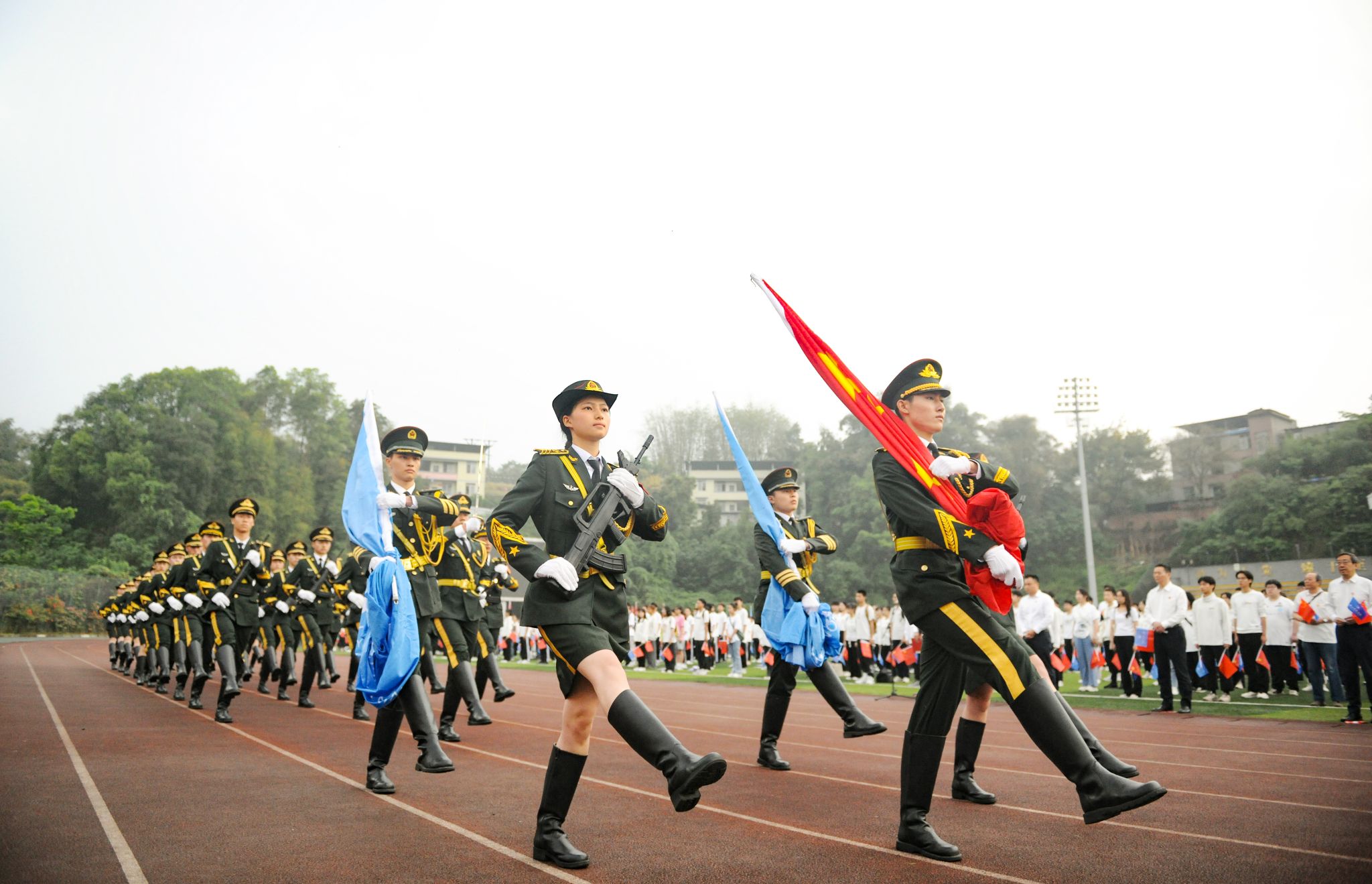 国旗护卫队队员们迈着整齐而坚定的步伐,喊着响亮的口号,护送国旗、校旗走向升旗台。伴随雄壮的《义勇军进行曲》,升旗手挥动臂膀划出优美弧线,鲜艳的五星红旗迎风展开,飘扬在蓝天下。在场师生高唱国歌,行注目礼。