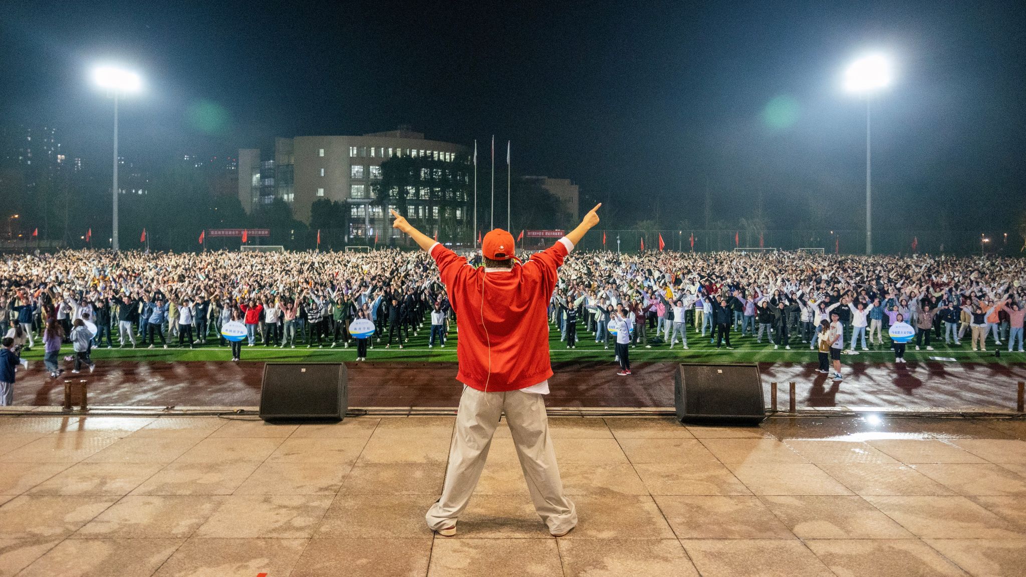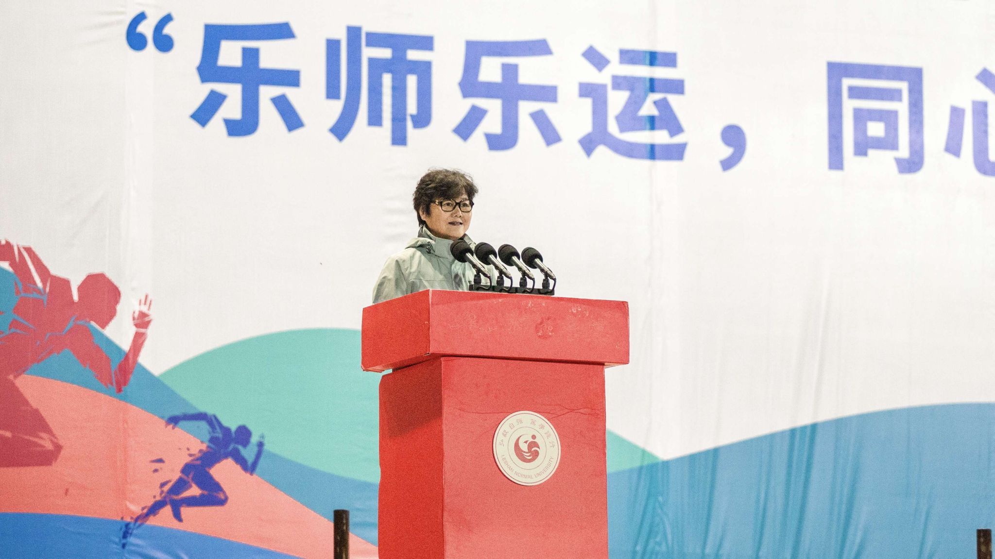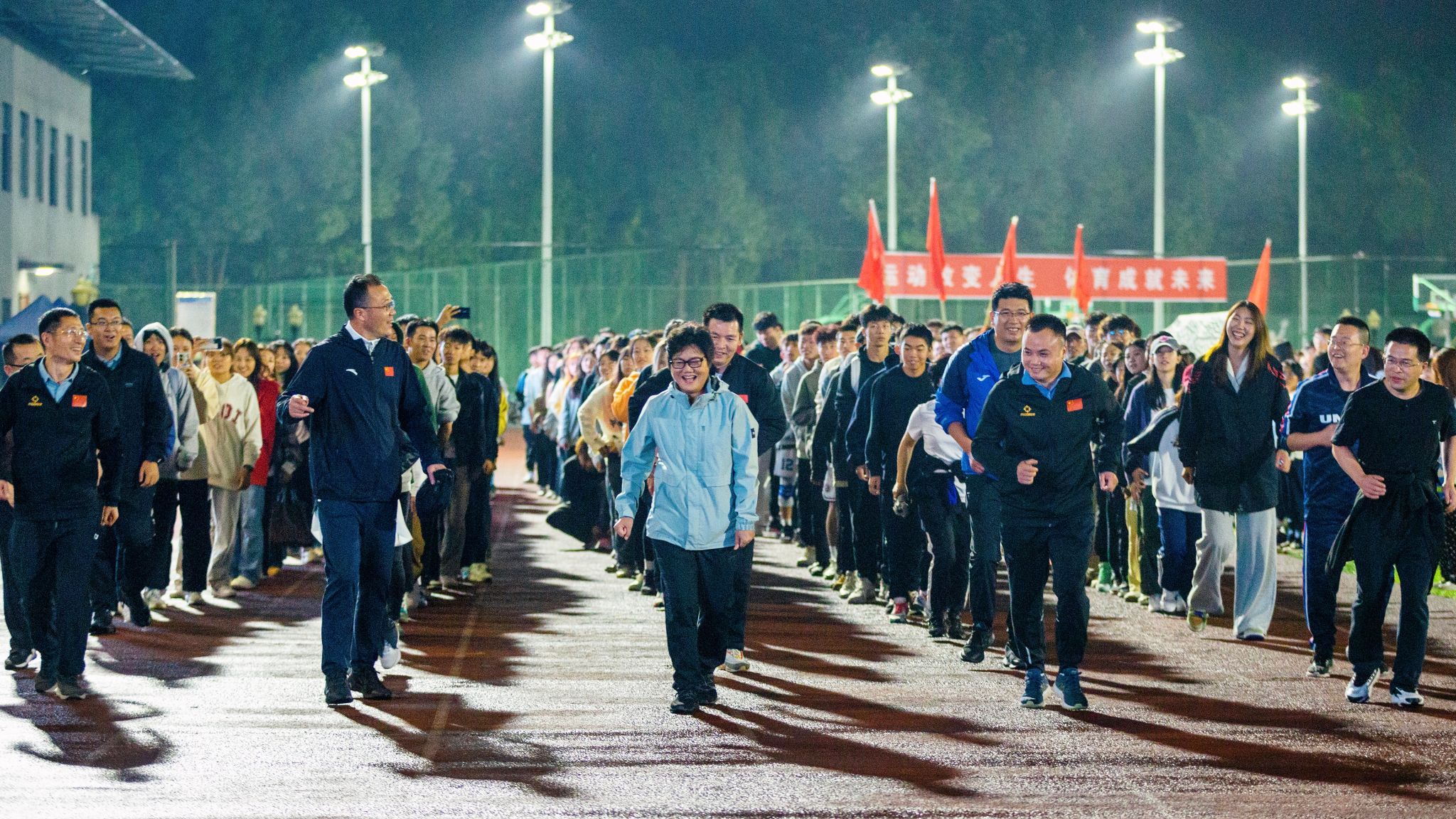 活动的最后由舞美俱乐部教师罗美林带领我校领导、老师以及全体大一学生进行热身活动,由奥运冠军张山女士带领全体人员进行了“开学第一跑”跑步活动。