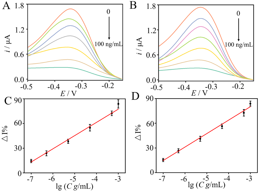 图3(A、B)不同浓度PVC/PS的DPV电流信号响应;(C、D)PVC/PS浓度与DPV电流信号响应的线性关系