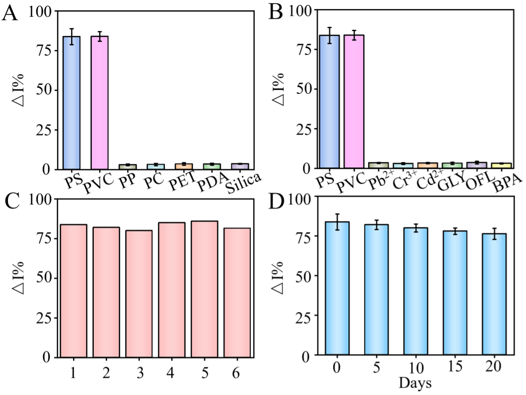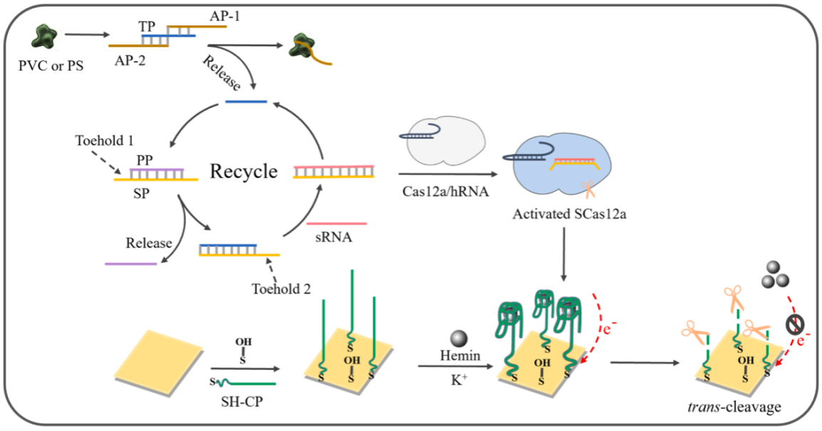 CRISPR/Cas12a(SCas12a)介导的级联链置换反应及适体(命名为CRISPR-MP系统),开发了一种新型无标记电化学生物传感器,用于微塑料的高灵敏度和高选择性检测。在该CRISPR-MP系统中,目标物聚氯乙烯(PVC)/聚苯乙烯(PS)可触发SCas12a介导的级联链置换反应,进而激活SCas12a的DNA酶活性。通过切割金电极表面G-四链体/血红素复合物的DNA探针,活性Cas12a可引发电化学信号的降低。该电化学适体传感器对PVC和PS的检测限分别达到37 ng/mL和45 ng/mL。本研究开发的CRISPR-MP系统拓展了CRISPR技术在微塑料检测中的应用,在人体健康保护和环境监测领域展现出重要应用前景。