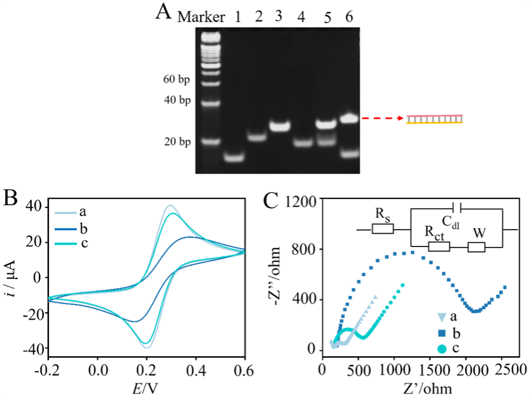 图2 CRISPR-MP系统的凝胶电泳(A),循环伏安(B)和阻抗(C)表征