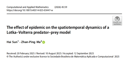 本网讯(文、图/樊华娜)近日,我院孙海教授与河南理工大学数学与信息科学学院马战平博士合作的两篇论文分别刊登在《International Journal of Biomathematics》,《Computational and Applied Mathematics》,我校为第一单位。两篇论文均聚焦非线性偏微分方程中的反应扩散模型展开研究。