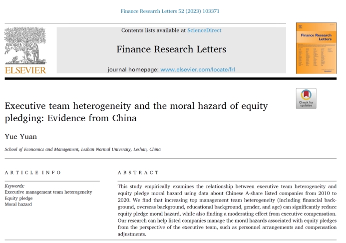 本网讯(文、图/罗富民)近日,经济管理学院袁月博士以第一作者身份在SSCI一区期刊《Finance Research Letters》发表了题为“Executive team heterogeneity and the moral hazard of equity pledging Evidence from China”的研究成果。