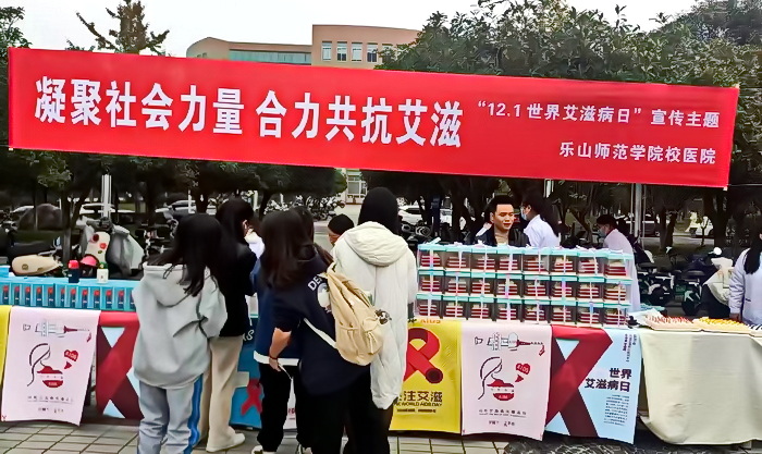 本网讯(文图/宋彦利)为了提高同学们对艾滋病的认识,掌握科学的“防艾”知识,增强大学生的自我保护意识,凝聚社会力量,合力共抗艾滋。在第36个“世界艾滋病日”来临之际,校医院联合泊水街社区卫生服务中心于11月30日上午在桂花广场开展了艾滋病宣传活动。