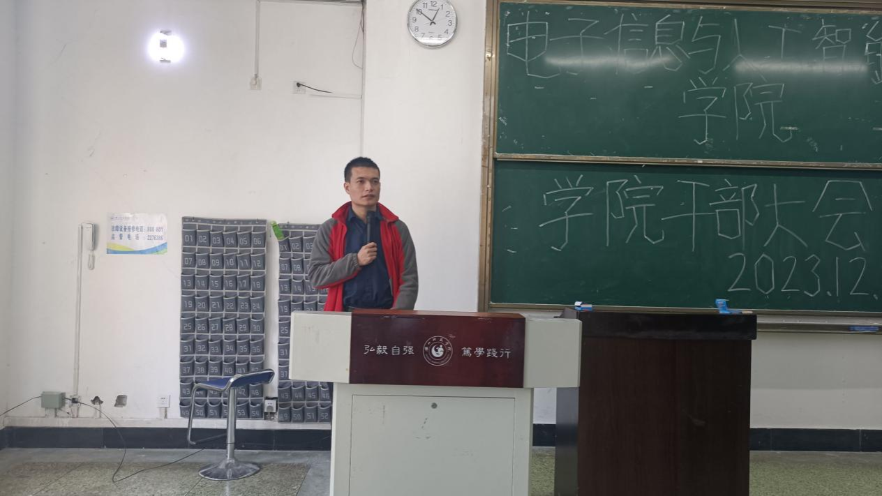 随后,强光平就近期的工作进行总结。强光平衷心感谢各位学生干部的辛勤付出。与此同时,对于学生干部在学习和生活方面存在的不良现象,也予以严肃批评,并强调学生干部应规范自身行为,以身作则,树立起良好的榜样。最后,强光平针对近期出现的问题向学生干部提出了以下四点要求:第一,坚定政治思想,不忘初心、牢记使命,全心全意为同学们服务;第二,发挥示范引领作用,展现出模范带头的效果,勇担责任,有所作为;第三,作为学生与学院之间的桥梁和纽带,及时反映同学们的意见和需求,积极与学院管理层沟通交流,促进师生之间的和谐互动与合作;第四,讲究工作方法,学会换位思考,善于与他人合作、协商和解决问题,不断提升团队协作和组织能力。