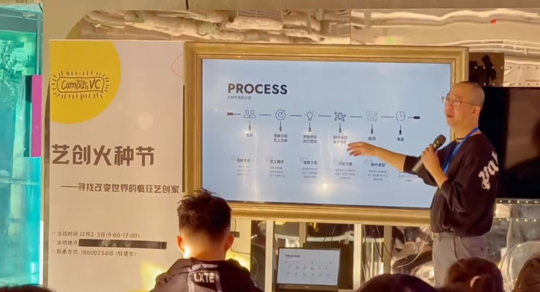 上午9点艺创火种节准时开始!校园VC创始人殷建松老师为大家介绍了本次艺创火种节的具体环节。在殷老师介绍完安排后,每一位同学都在火种节小程序中,提出了自己的创业创意。通过大家的投票,最终诞生了6个项目。每位项目创意的提出者,成为了团队CEO。通过阐述想法,吸引成员加入团队,其他成员都选择了自己喜欢的团队,最终6个团队组建完成。他们各自用1分钟阐述了己方项目后,导师便对有创意的项目进行问答互动与项目打磨,在同学与导师的共同努力下,此项进程完美结束。