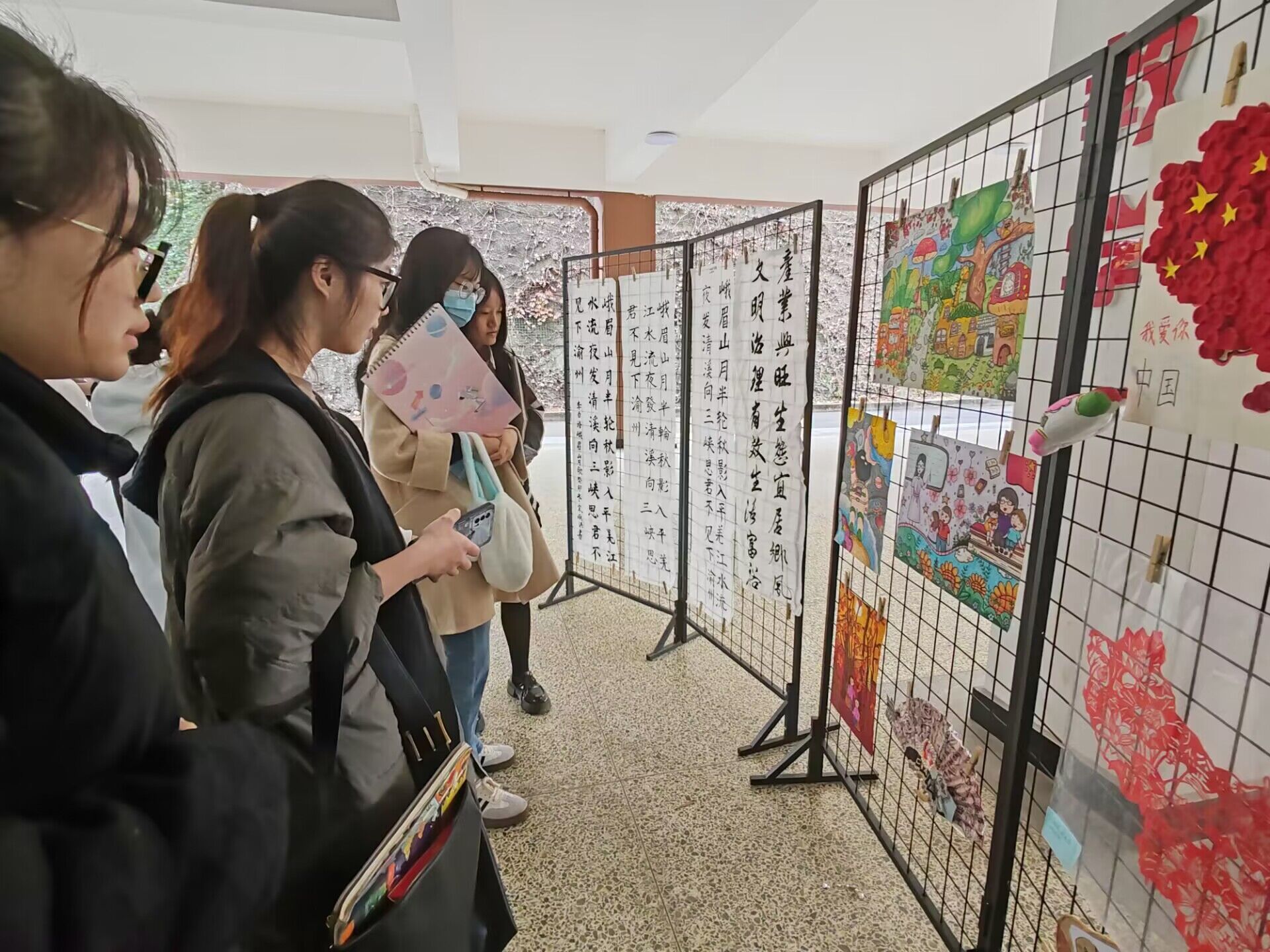 师范生技能大赛结束后,将精美的手工、绘画、书法作品的作品拍照记录,发布在易班、微信公众号等网络平台,供同学们相互欣赏、交流学习,激发了同学们对教具制作以及书法练习的热情。同时,还在学院大楼举办了作品展览,一件件优秀的手工作品以及书法作品被有序的摆上展台,同学们在上下课的途中被吸引。精致漂亮的手工制品展现了学前同学们灵活的动手技能:泥塑的小老虎可爱灵动,形象各异的面具色彩鲜艳,有趣的纸艺花栩栩如生。而一幅幅优秀的书法作品则展现出小教同学的书法功底,他们用墨水挥洒豪情,一首峨眉山月歌跃然纸上,锋利的弯钩,流畅的横竖,字里行间都透露出书法之美。同学们的称赞声不绝于耳,在感叹的同时,他们也在观赏中得到了创作启发,激发了自身提升师范专业技能的动力。
