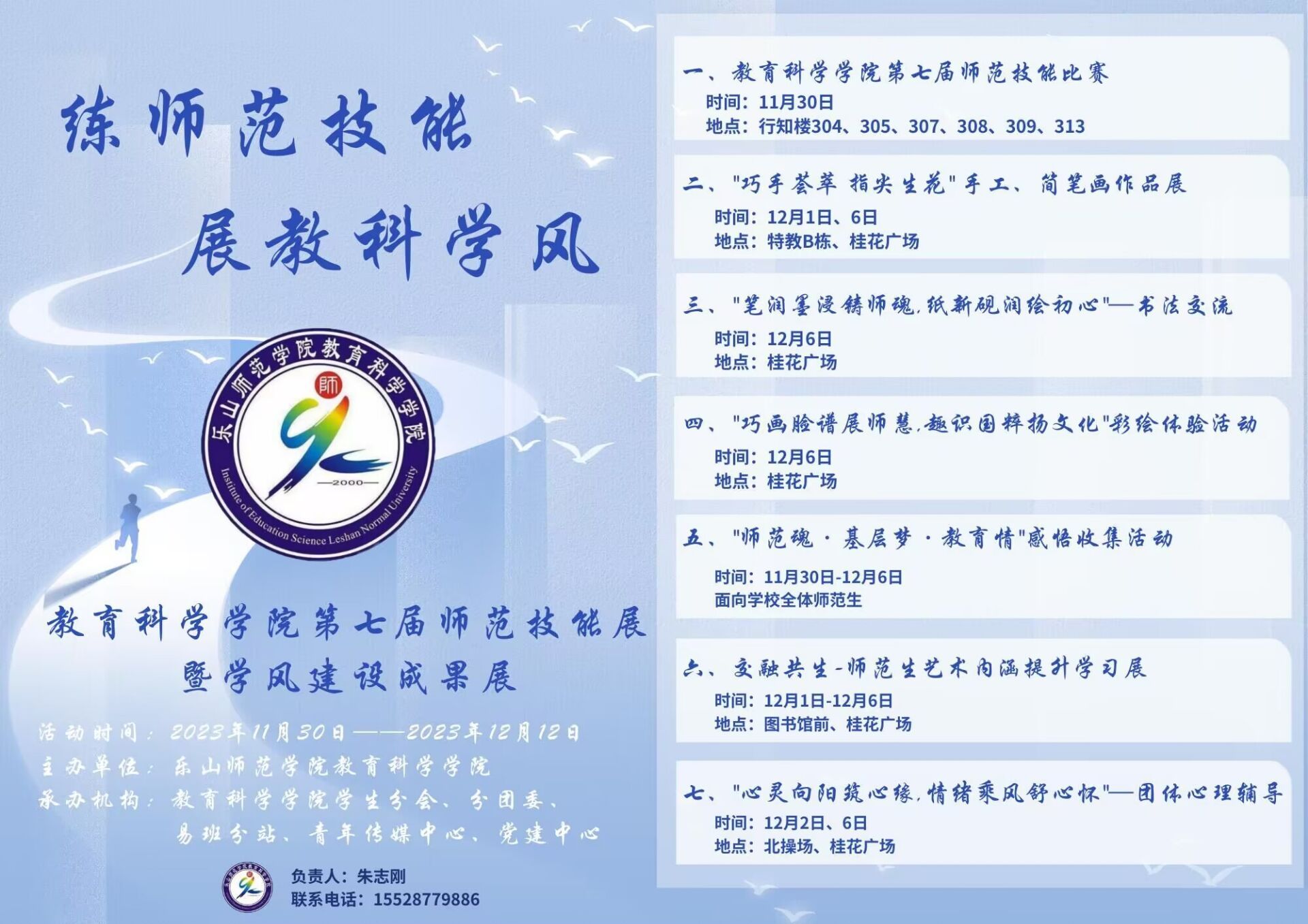本网讯(文/易冰冰 图/朱梓菡)为总结学院学风建设成果,引领学院学生形成良好的学习氛围,教育科学学院于11月30日、12月6日先后在教科学院、桂花广场开展了以师范技能展示为核心的学风建设成果展,学院师范专业学生和近十余位专业教师参与。