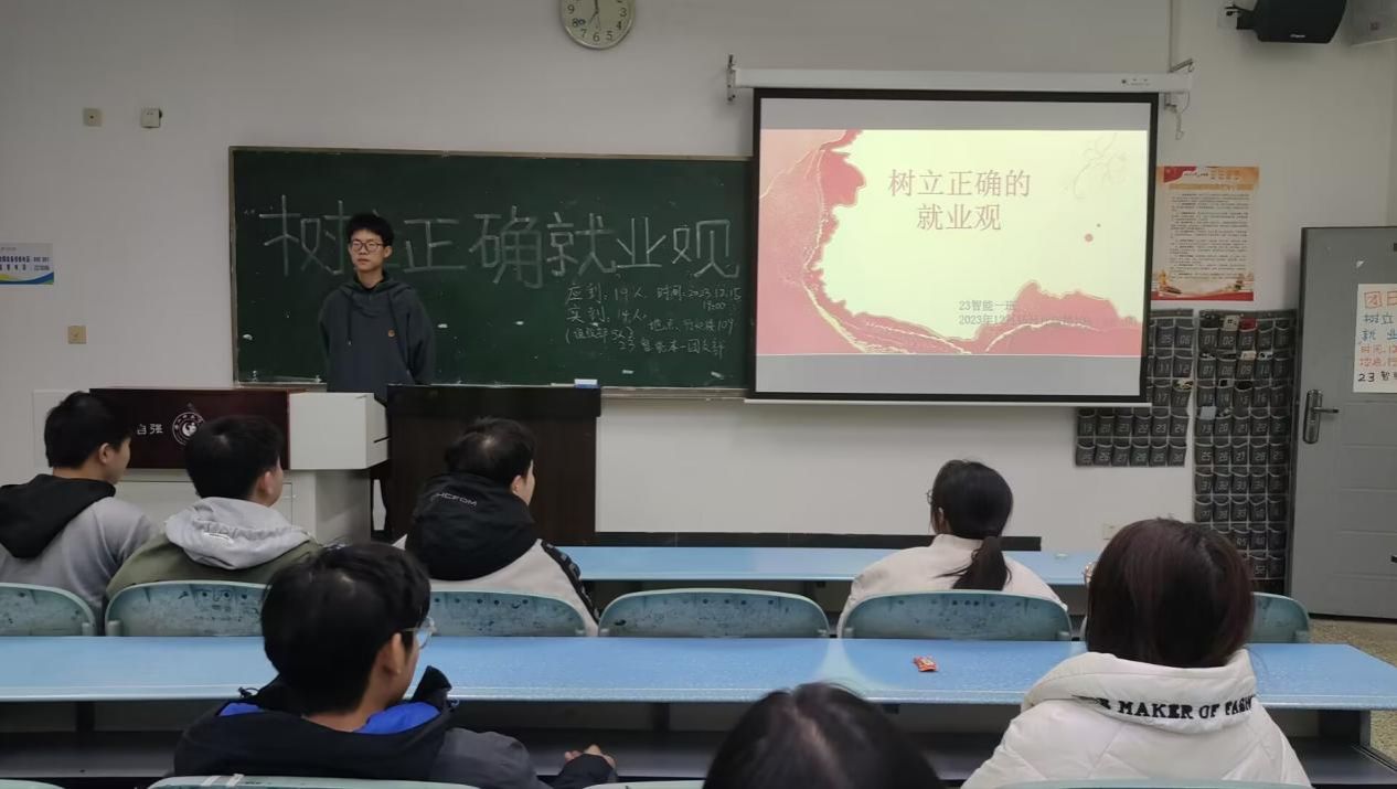 本网讯(文/张宇昊 图/官辉)近日,电子信息与人工智能学院在行知楼组织学生开展“树立正确的就业观”主题团课。此次团课旨在培养团队协作精神和创新能力,明确职业规划,以更积极、务实的态度面对就业。与此同时,进一步激发学生的爱国情怀和社会责任感。本次团课由23级各班团支书主持,23级全体学生共同参加。