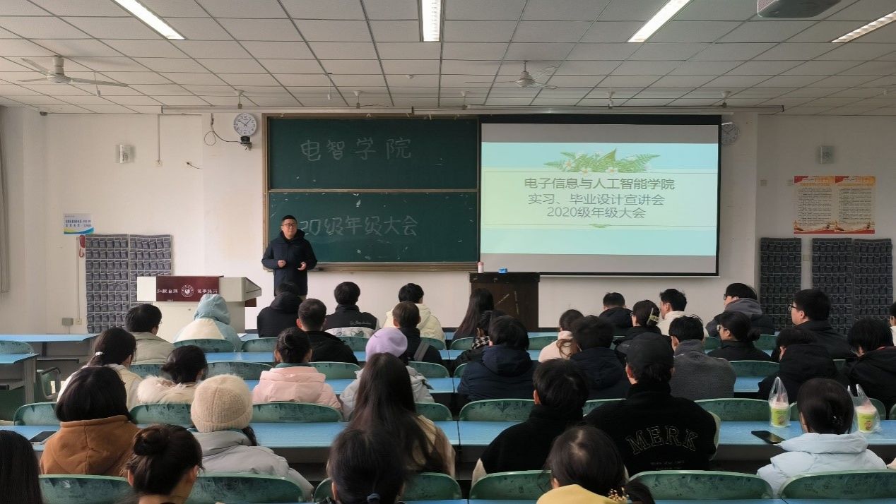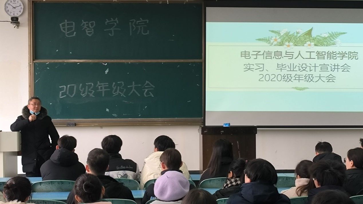 本网讯(文/任燕 图/付翰林、陈江)12月25日,电子信息与人工智能学院20级在行知楼225召开年级大会。此次大会旨在为即将步入社会的毕业生提供全面实用的指导,帮助同学们顺利完成毕业设计,并成功找到心仪的实习单位。本次会议由电子信息与人工智能学院副院长黄果、考研指导老师敬思远以及20级辅导员谭红梅进行宣讲,20级全体同学共同参与。