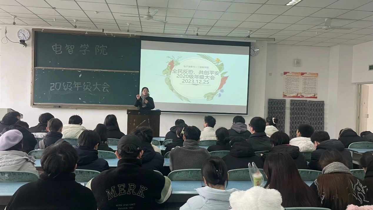 最后,谭红梅就元旦放假的假期安排、饮食问题等假期安全事项进行了宣讲,她强调要加强同学们自身的安全意识和警惕性,做好一切防范措施,保障自己和他人的人身安全。谭红梅还以“全民反恐 共创平安”为主题讲述了全民反恐的重要性,强调同学们应高度警惕,积极参与到反恐斗争中。