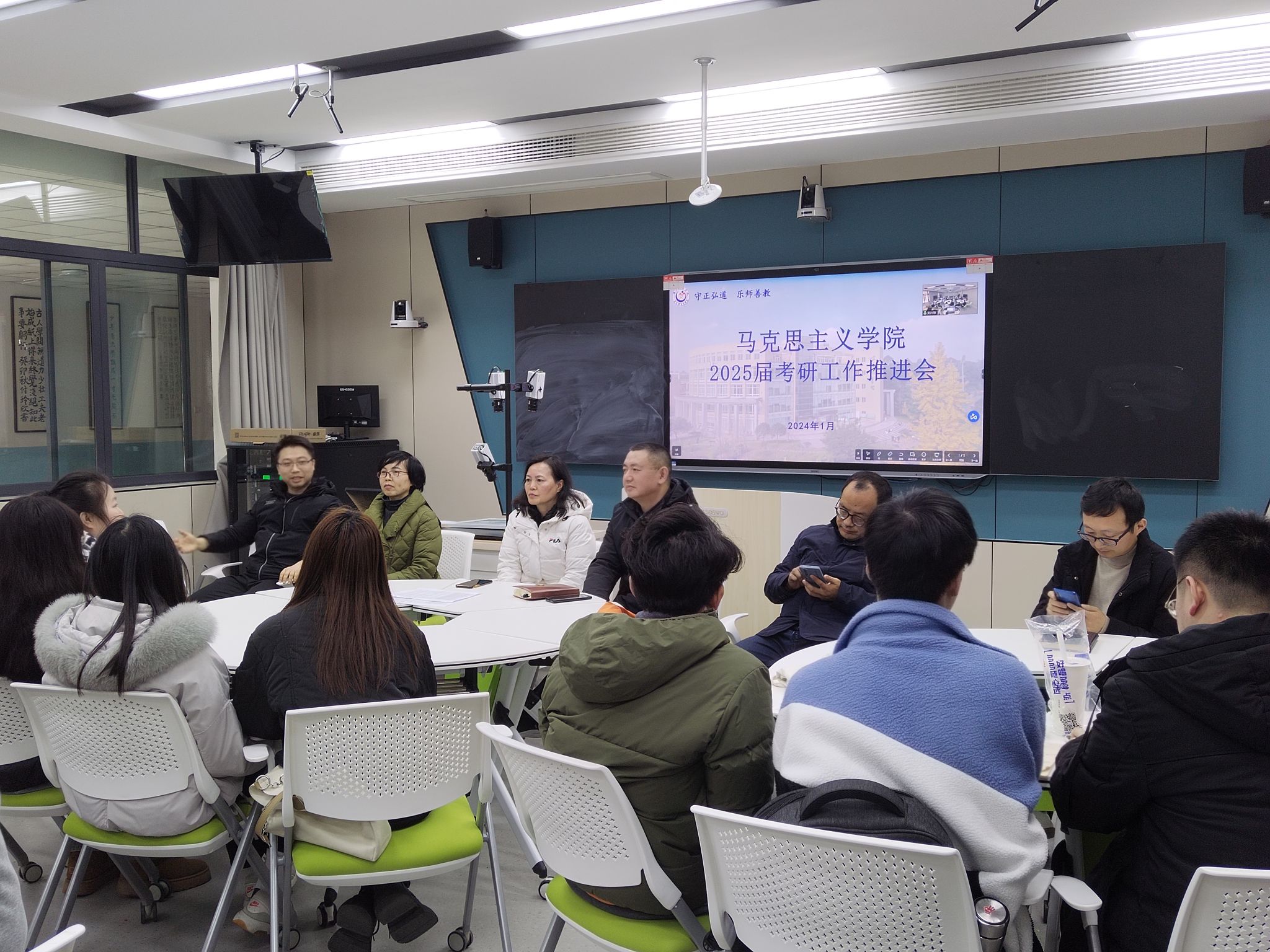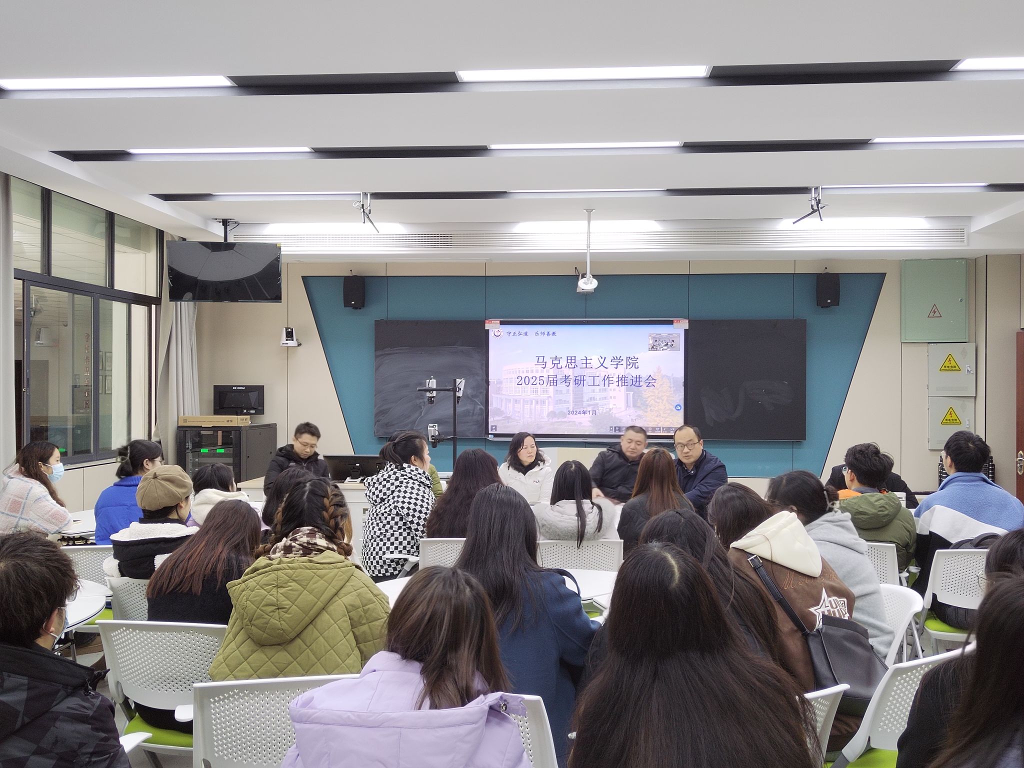 本网讯(文/尹桐 图/付玲欣)为进一步促进和强化全院学生学习的积极性,创造好学、乐学、上进的学习氛围,加强同学们对考研的认识和了解,帮助同学们明确考研的奋斗目标。1月5日,马克思主义学院于实训楼B104教室开展2025届考研工作推进会。学院党委书记李涛,院长郑文杰,党委副书记、纪委书记钟永淑,副院长蒋政、赖伟,思想政治教育系主任官远程,专任教师韩俊和辅导员张红丽出席会议,2021级60位准备考研的同学参加,本次会议由钟永淑主持。