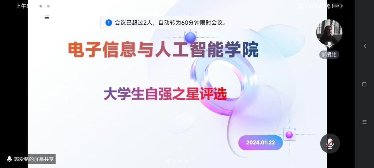 本网讯(文、图/陈江)1月22日,电子信息与人工智能学院在线上开展大学生自强之星评选大会。本次会议由电子信息与人工智能学院分团委书记强光平,辅导员雷雄锴、肖苗、狄红霞,部分主席团成员以及评委干部共同参与。