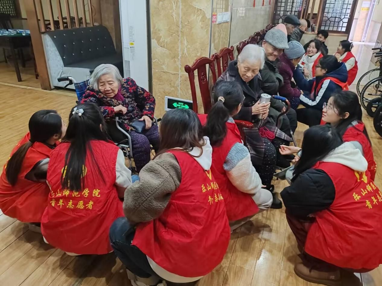 “我们选择牵着他们的手,默默陪伴在他们身旁,哪怕只是眼神交流,我们也能感受到爷爷奶奶们内心洋溢的幸福感”。在乐山市嘉苑养老院,不少老龄朋友有视听或者智力障碍,加之儿女常年不在身边,变得愈发孤独与自闭,更无法顺利和志愿者们沟通,但志愿者们对部分特殊的长者们采取“扮演其子女”的陪护模式,用真心拉近彼此距离。