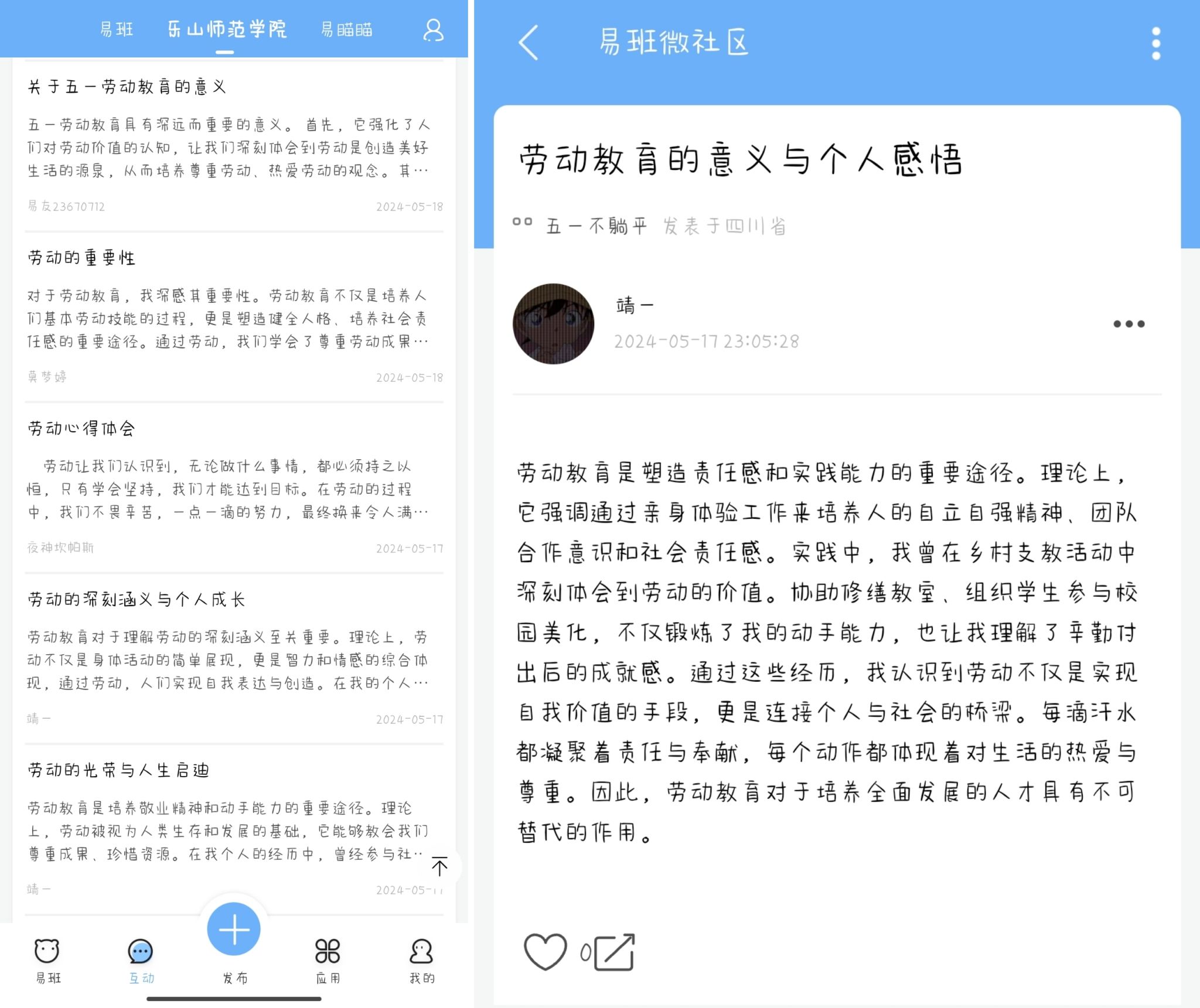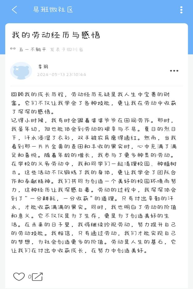 随着劳动文化宣传活动的深入推进,电子信息与人工智能学院的学生们纷纷响应,积极参与其中。他们在易班微社区上分享着自己的劳动故事,记录着每一次劳动的点滴,也表达着对劳动教育的深深理解和感悟。