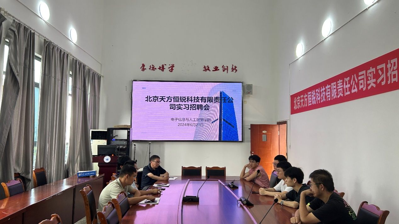 本网讯(文图/张莎莎)近日,电子信息与人工智能学院在特教C501开展北京天方恒锐科技有限责任公司实习招聘会。会议旨在为电智学院的学生们提供一个展示自我、实现梦想的舞台,同时也为北京天方恒锐科技有限责任公司选拔优秀人才提供了良好的平台。此次招聘会由电智学院2021级计算机与科学专业的学生参与。