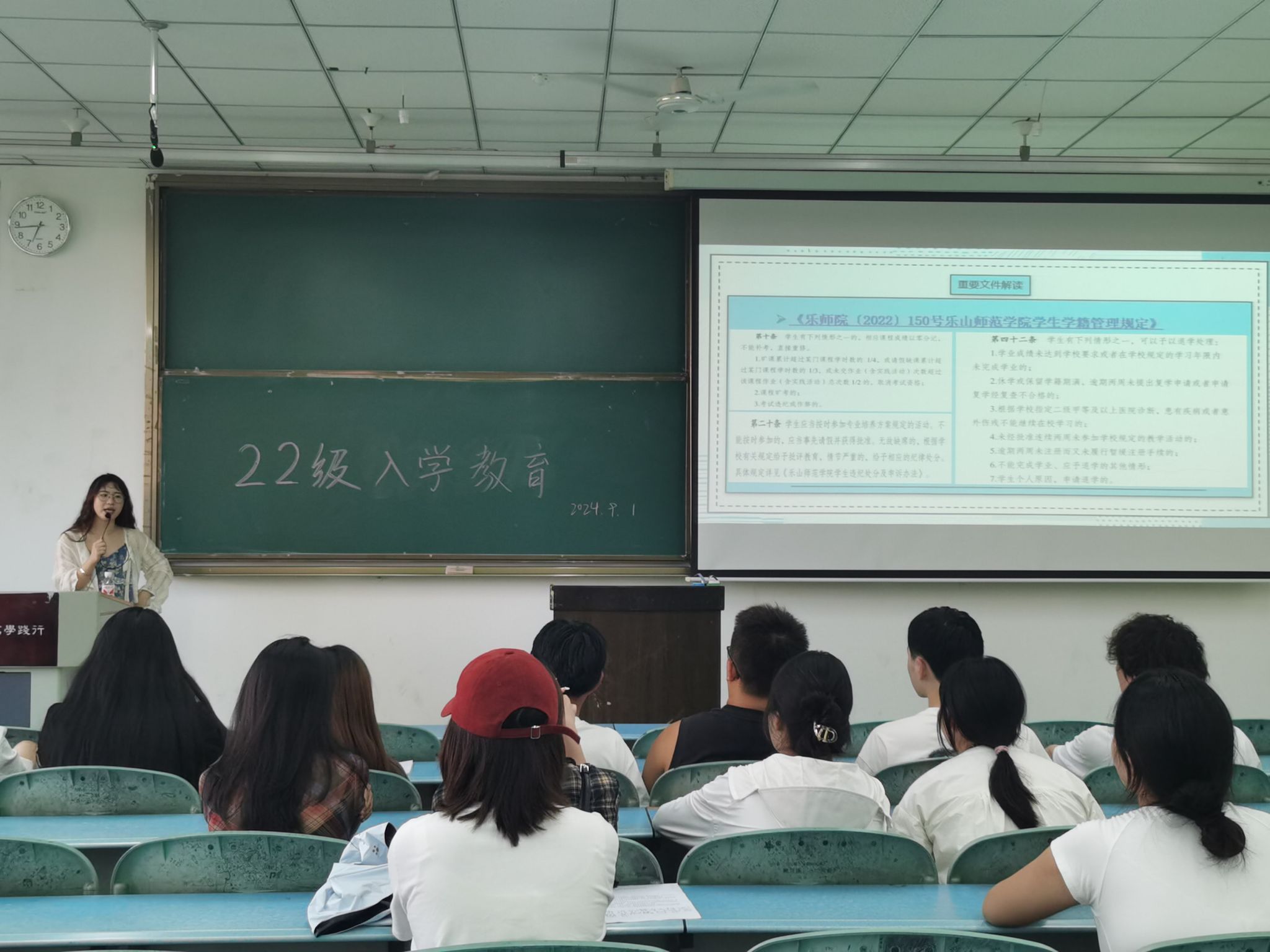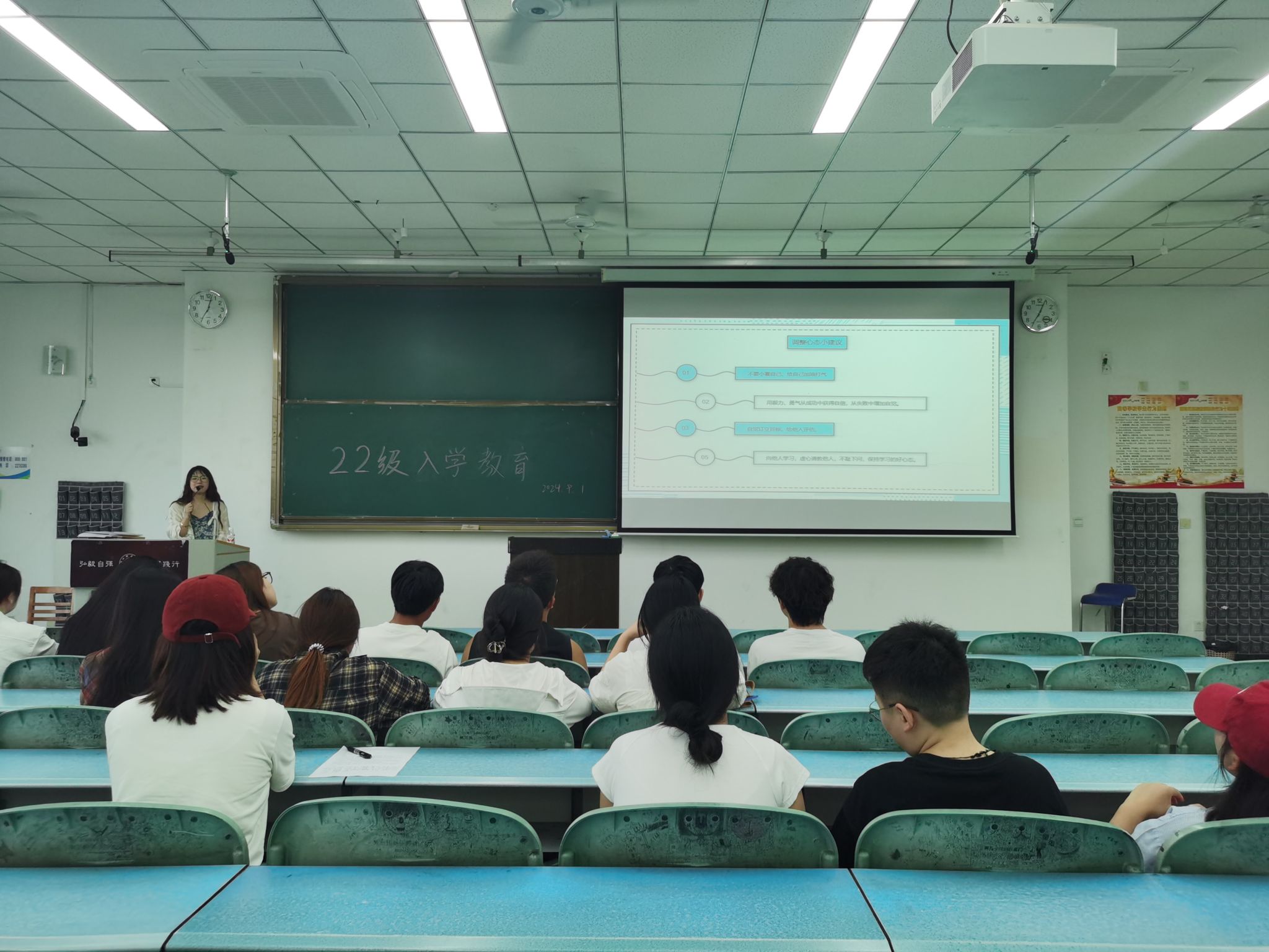 本网讯(文/江琳 图/蒋力豪、陈美钰)为扎实做好专升本新生入学指引工作,帮助专升本新生们完成心理转型与角色重塑,尽快适应新的大学生活。9月1日晚,法学与公共管理学院在行知楼425教室召开2024级专升本新生入学教育。入学教育由辅导员江琳主讲,2022级学生助理、2024级全体专升本新生参加。