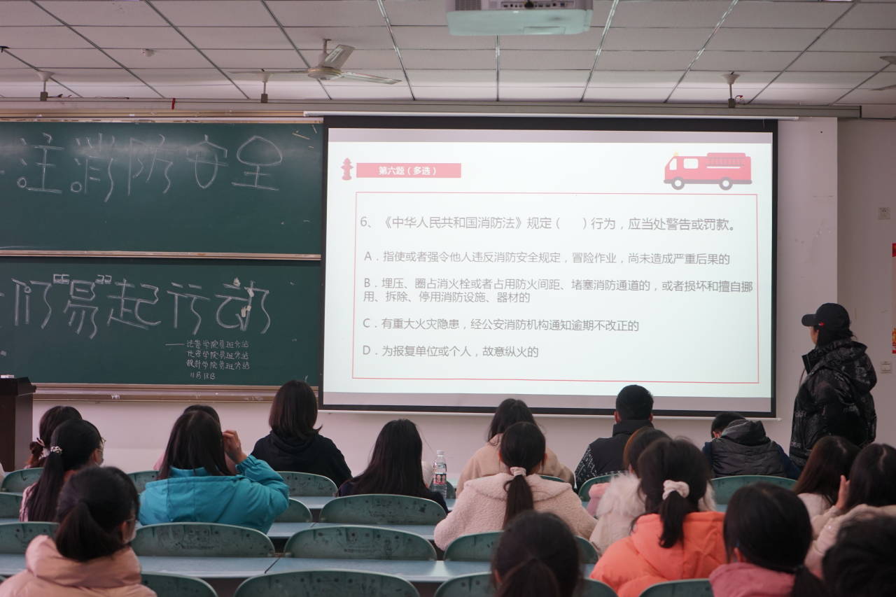 本网讯(文/秦春艳 图/钟宇桐)为了普及消防知识,增强消防观念,提高同学们对突发事件的处理能力,法学与公共管理学院、设计学院、化学与资源管理学院以及三江潮易班工作站于11月18日在行知楼101共同举办了消防知识安全竞赛。法学与公共管理学院学生邓琪、化学与资源管理学院学生赵科富主持此次竞赛,法学与公共管理学院易班副站长胡斌、化学与资源管理学院副部长黄彦雨、谢定清担任此次竞赛的评委,45名选手参与此次竞赛。