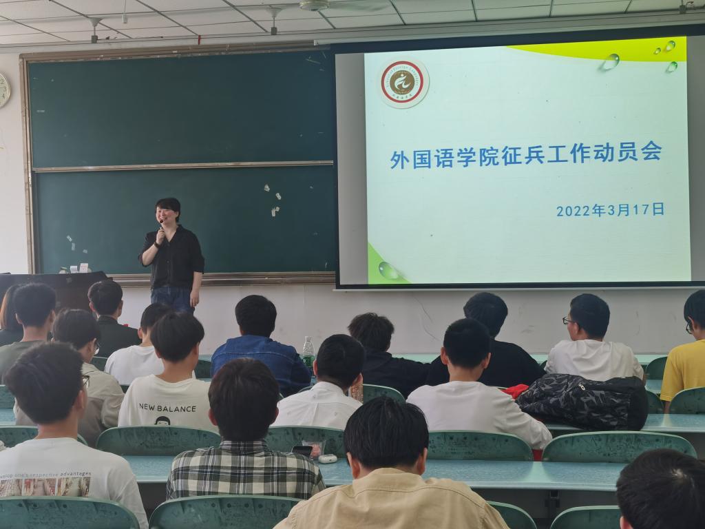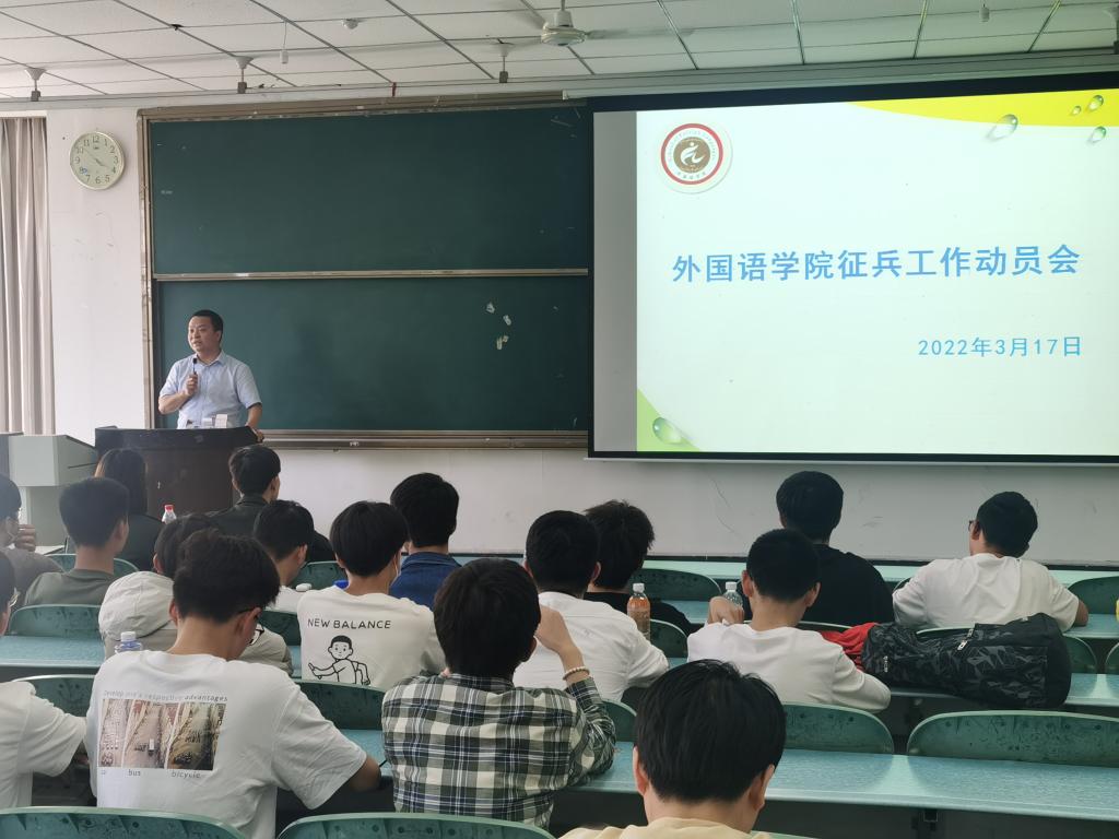 本网讯(文、图/曾云超 )2022年3月17日,外国语学院在行知楼101召开2022年度征兵宣传动员会,本次动员会邀请了卡塔尔世界杯决赛波胆预测 武装保卫部副部长梁光德、干事徐凌云以及退役学生夏彩玲、杨洋进行宣讲,外国语学院全体辅导员以及1-4年级全体在校男生参加了本次动员会,会议由学院党总支副书记吴小彦主持。