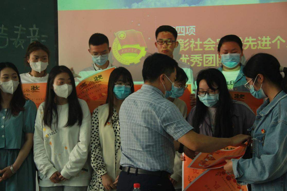 新能源材料与化学学院实践团队及教科学院“心萤”团队分享了他们在特色文化宣传,基层社会实践,志愿服务与招生宣传方面的工作,向大家分享了团队在社会实践中获得的经验,鼓励更多同学参加社会实践。分享结束后,团委学生副书记杨星雨上台宣读表彰决定,并由翟雅媛、李东为先进个人代表及优秀团队颁奖。
