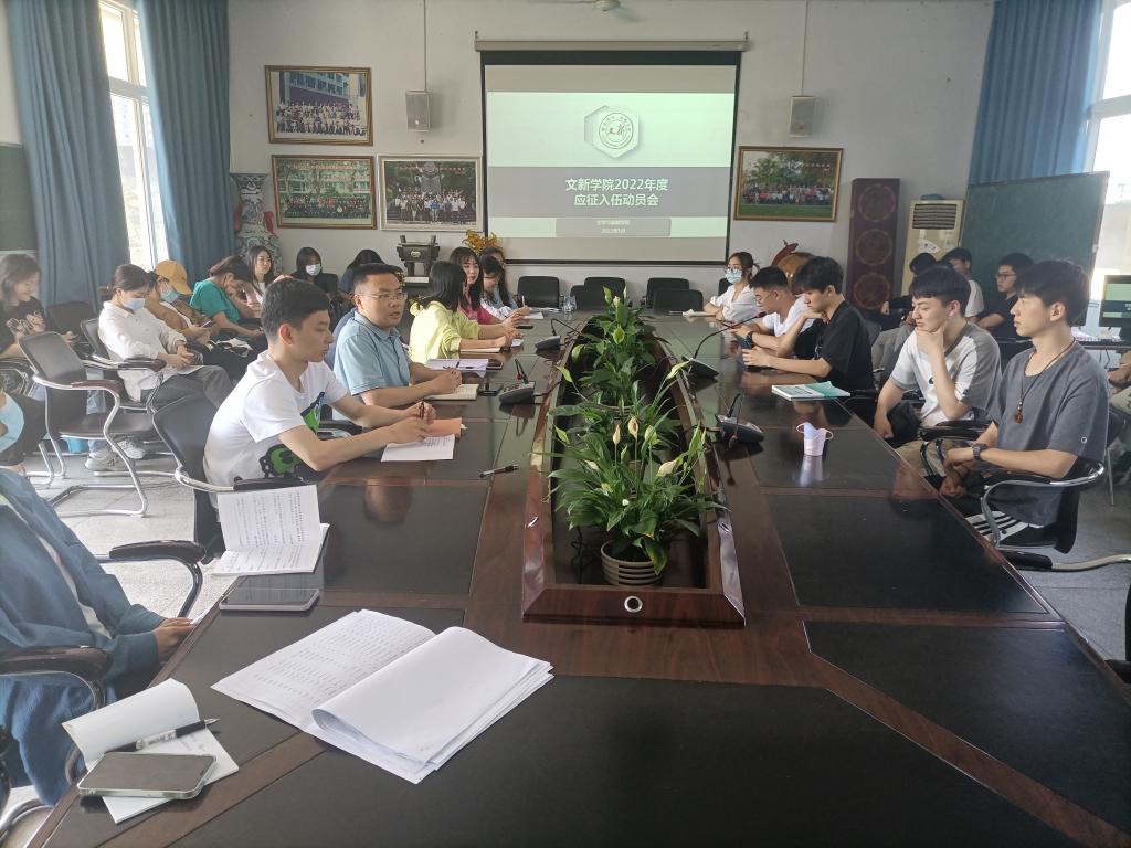 本网讯(文、图/汪小钰)有志青年从军建功,热血男儿矢志报国。为进一步落实大学生应征入伍的相关工作,文新学院于3月19日召开了2022年度应征入伍动员会。党总支副书记胡平建、学院全体辅导员和学院团学干部参加了本次动员会。