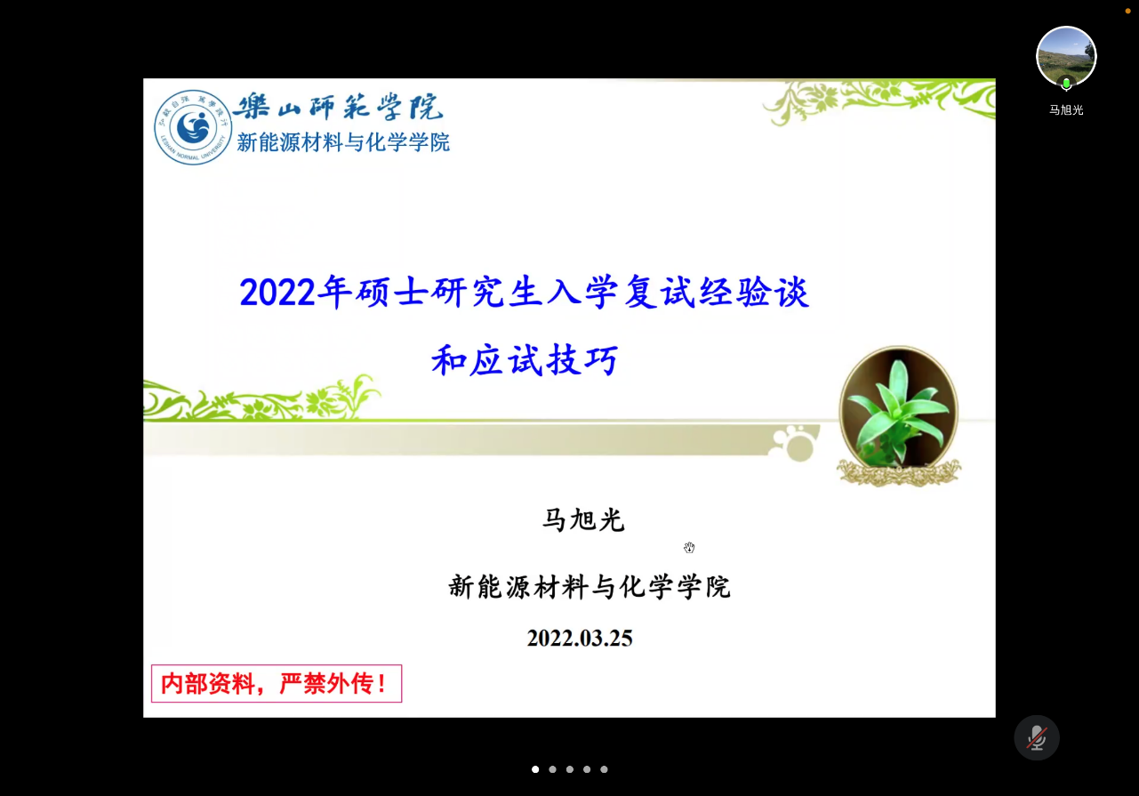 本网讯(文图/武拥建)为了做好2022届毕业生的考研复试工作,助力考研学生顺利上岸,3月25日晚,新能源材料与化学学院通过腾讯会议举行2022届毕业生考研复试专项培训,学院党委副书记孙国峰(主持党务工作)、副院长马旭光、毕业班辅导员武拥建以及2022届考研上线学生参加了此次培训会。