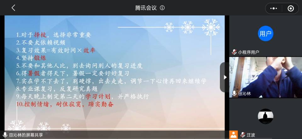本次考研分享会精彩纷呈,师兄师姐们以自己的亲身经历向同学们讲述了考研的宝贵经验,给立志考研的同学指引了方向,使他们掌握了一些应考技巧,并对考研过程有了一个更具体、更清晰的认识,为以后考研打下了坚实的基础。