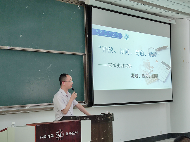 本网讯(文/刘佳怡,图/李怀宇)5月31日,经济管理学院于行知楼214召开京东实训动员大会,学院党委副书记丁敏娜、副院长罗富民、京东主管王小宇、金鑫等参加了会议。