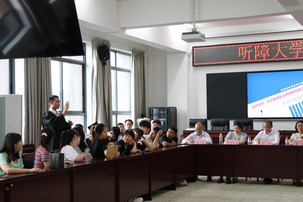 本网讯(文/生辉 图/尹馨媱)为深入了解我院听障毕业生就业情况,进一步提高就业支持质量,6月16日上午,四川省残疾人联合会教就处处长肖奎、副处长景义婷、乐山市残联副理事长曲云峰、乐山市残联康就科科长段沧红一行4人到特殊教育学院、康复学院开展听障大学生就业座谈会,特教学院、康复学院院长张梅、残疾人教学部主任生辉以及2022届全体听障毕业生及部分家长参加了此次座谈会。