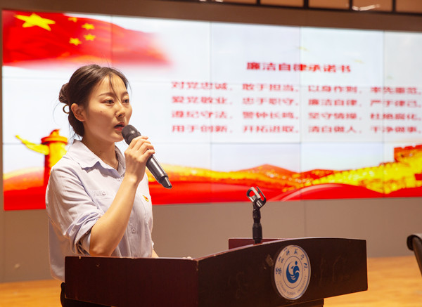 本次党课以“不忘初心跟党走,廉洁自律作表率”为主题。杨虹强调:作为一名青年党员,一要带头守纪律、带头讲规矩,没有规矩,不成方圆,要走好人生的第一步,以饱满的热情和昂扬的斗志投身社会。二要带头廉洁从业,守好自己的岗位,诚实守信,遵守法律,遵守党章各项制度。接着,全体毕业生党员在杨虹的带领下重温入党誓词,大家面向党旗,全体起立,举起右手,庄严宣誓,毕业生党员代表宣读廉洁自律承诺书。最后,杨虹,吴嘉川为毕业生党员赠送廉洁教育书籍。