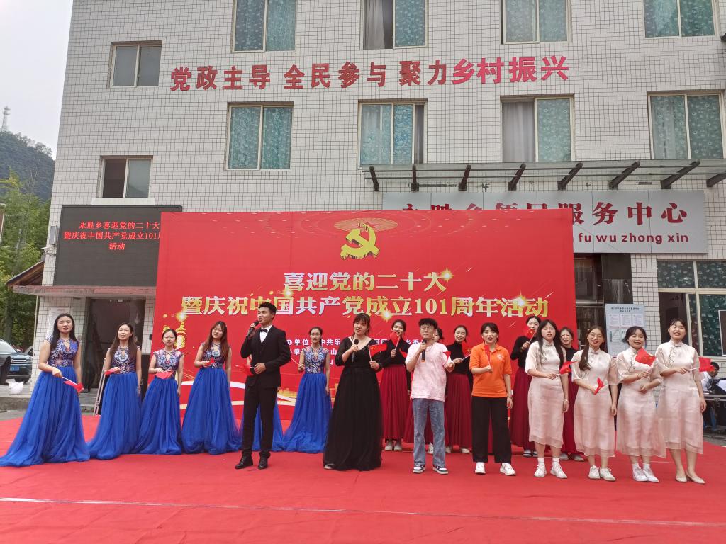 本网讯(文、图/罗智勇)文艺下乡,百姓称赞;实践成员,青春飞扬。2022年6月30日,音乐学院和旅游与地理科学学院暑期社会实践文化艺术服务团30人前往金口河区永胜乡开展文化艺术服务活动。本次活动以“喜迎二十大、庆七一”和“宣传国家、省民族政策”为主题,以学生志愿者为依托,鼓励大学生下基层,知民情,宣传民族政策,为当地村民带去丰富多彩的文艺表演。活动全程成果显著、形式多样、宣传及时。得到了当地领导和村民的一致赞赏,同时也受到了当地媒体的关注及相关报道。