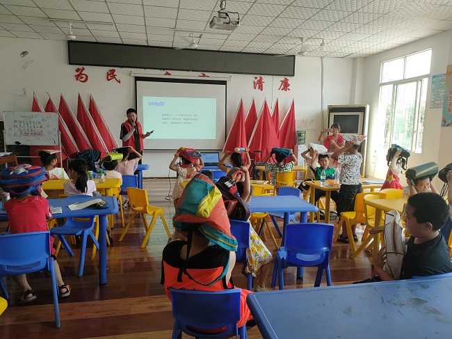 本网讯(图、文/虞青松)7月12日,旅游与地理科学学院“三下乡”社会实践团队——青春伴成长志愿服务队的活动已经开展到第八天了,在这八天里,该团队在学院分团委书记喻剑老师的带领下,紧密结合实际,在各站点组织开展了爱国主义教育、夏季防暑、防震演练、防火灾应急演练、防触电演练等主题活动,并有序组织学生开展日常课业辅导。