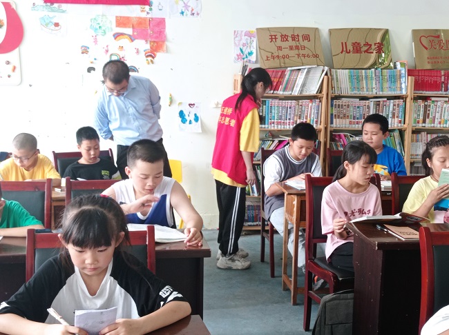 喻老师到达服务站点后,立即投入到志愿服务工作中,他检查小朋友的作业,为学生答疑解惑。为了更好地提高志愿服务质量,喻老师还特地向小朋友们了解对团队服务成员们的反馈信息。