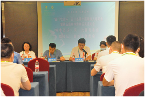 四川省残疾人联合会宣文处副处长樊轶就比赛相关要求做了讲话,樊轶表示,残运会是残疾人士展示自己的大舞台,能进一步促进残疾人身心健康,融入社会。樊轶对教练员提出了几点要求:一是要严格赛风赛纪,尊重裁判;二是要尊重参赛队伍,理解、尊重、关心和帮助残疾人运动员;三是加强安全管理;四是裁判员队伍与运动员要相互支持配合,工作中遇到问题应及时沟通解决。