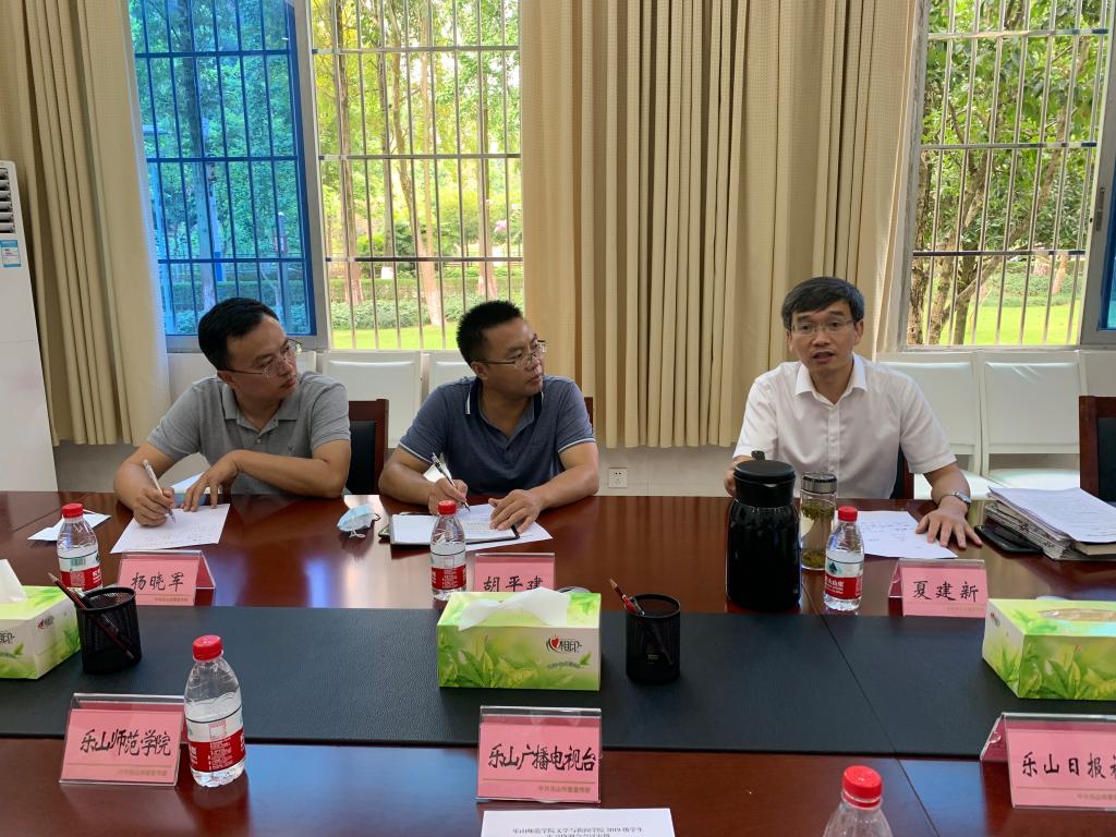 本网讯(文、图/杨阳、齐虎)9月2日上午,文新学院新闻、网新专业集中实习协调会在乐山市委宣传部会议室召开,标志着世界杯葡萄牙vs加纳波胆预测 和乐山市委宣传部共建新闻学国家级一流本科专业的工作正式拉开了序幕。乐山市委宣传部副部长夏建新、文新学院副书记胡平建、副院长杨晓军、卡塔尔世界杯决赛波胆预测 教务处实践教学科刘夏及市委宣传部新闻科、干部科、乐山市级媒体相关负责人参会,会议由夏建新主持。
