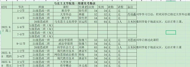本网讯(文、图/张红丽)疫情下,开学季!9月5日至今,“云端课堂”开展10天,为保证线上教学平稳有序,确保同学们网络课堂能够实现更高的效率,马克思主义学院坚持每日组织师生通过深入课堂听课考勤、收集学生线上学习的困难意见,倾听老师们的建议意见,在全院师生的共同努力下,云端课堂顺利开展,马院学生总体学习情况良好。