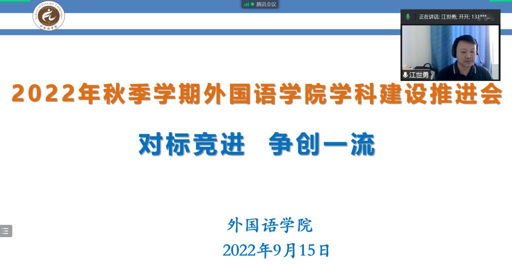 本网讯(文、图/陈开富)9月15日,外国语学院在腾讯会议平台举行了2022秋季学期学科建设推进会。由学院副院长陈开富主持,外国语学院学科英语和翻译团队骨干教师参加了会议。