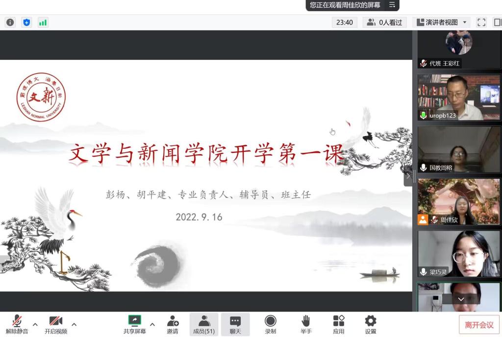 本网讯(文/王鑫 图/王彩红)受疫情影响,今年秋季我校学生延迟返校,9月5日,全校师生正式开始线上教学,同学们开始了新学期的学习。同时,在保证师生安全的情况下,卡塔尔世界杯决赛波胆预测 采取线上“云报道”的方式与新生“见面”。为顺利开展网络课程,安排新学期学生工作,9月16日,文学与新闻学院集中开展了“开学第一课”,学院党委书记彭杨、党委副书记胡平建,各专业负责人、辅导员、新生班主任及2022级新生共同参与。