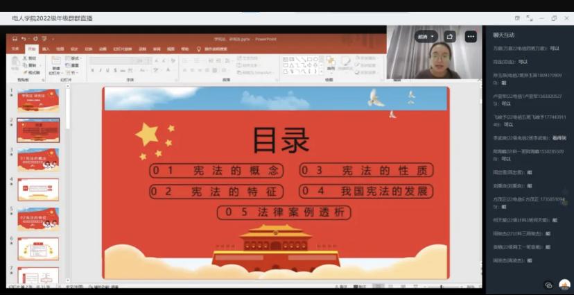 本网讯(文、图/肖苗)2022年9月22日下午13点,电子信息与人工智能学院召开2022级新生线上“学宪法、讲宪法”活动。学院辅导员肖苗和2022级全体新生参加,会议由肖苗主持。