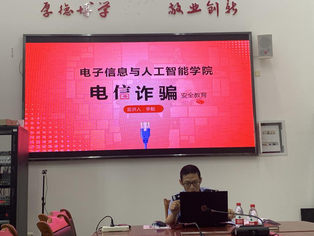 本网讯(文、图/肖苗)2022年9月22日下午16点,电子信息与人工智能学院2022级新生防电信诈骗宣讲活动在特教C栋501会议室举行。学院辅导员强光平、肖苗和2022级全体新生参加,泊水街道派出所驻校民警李毅警官特邀出席。会议由肖苗主持。