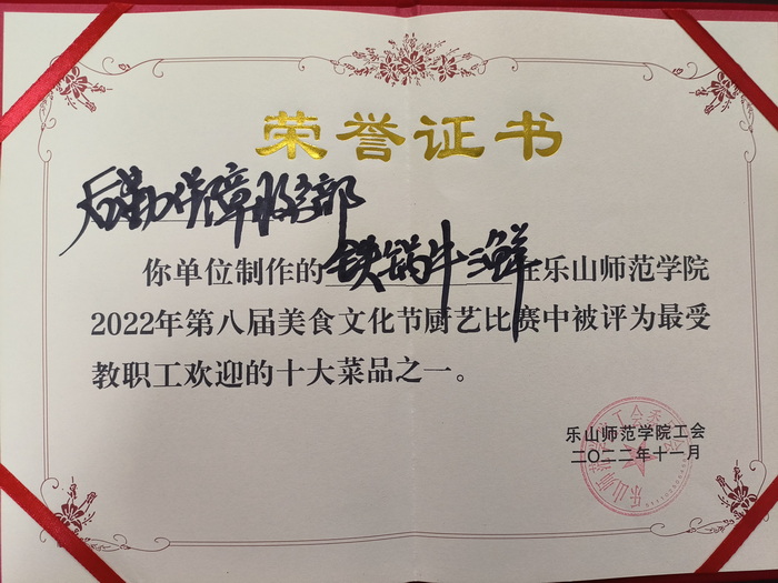 饮食中心制作的铁锅牛三鲜、肘遍天下、良宵游 、香酥米粉肉、风味凤爪五个菜品荣获“最受教职工欢迎的十大菜品之一”荣誉称号。