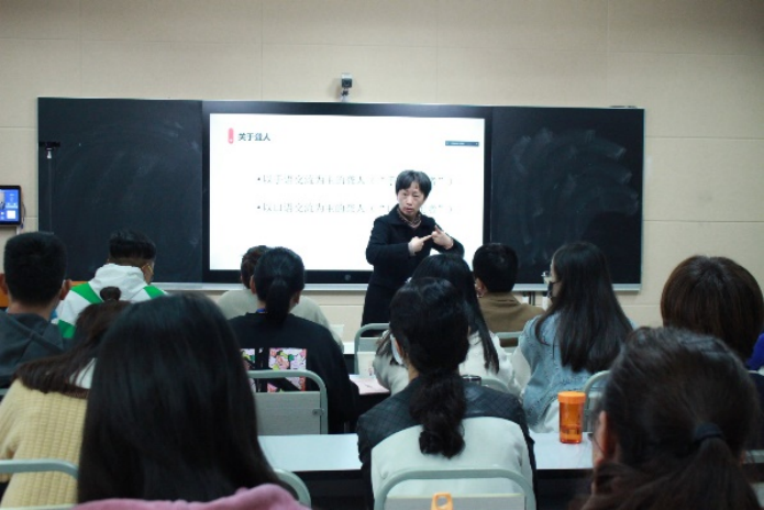 11月1日下午,由中国聋协手语研究与推广委员会邱丽君开展以“通用手语应用的必要认知”为主题的讲座。她认为推广国家通用手语是贯彻落实国家语言文字十三五、十四五规划的重要举措;是国家通用语言文字的重要补充;是落实十九大提出的“坚持以人民为中心”,推动全面建成小康社会的具体举措;是聋人学习、交往、参与社会生活的重要推动力。通过《中国手语》和《国家通用手语词典》的对比,强调《国家通用手语词典》更加注重手语的视觉规律。同时,她指出,通用手语是在地方手语基础上产生的,提倡通用手语,不排斥地方手语,但使用场合不同。除此之外,邱丽君还通过大量的例句介绍了手语的概括性和指定性、视觉空间的同时性等特点、类标记的用法、汉语转写符号、关于复数和强调意思的表达,以及应用手语过程中应注意的细节等问题,进一步提高了学员手语表达能力。